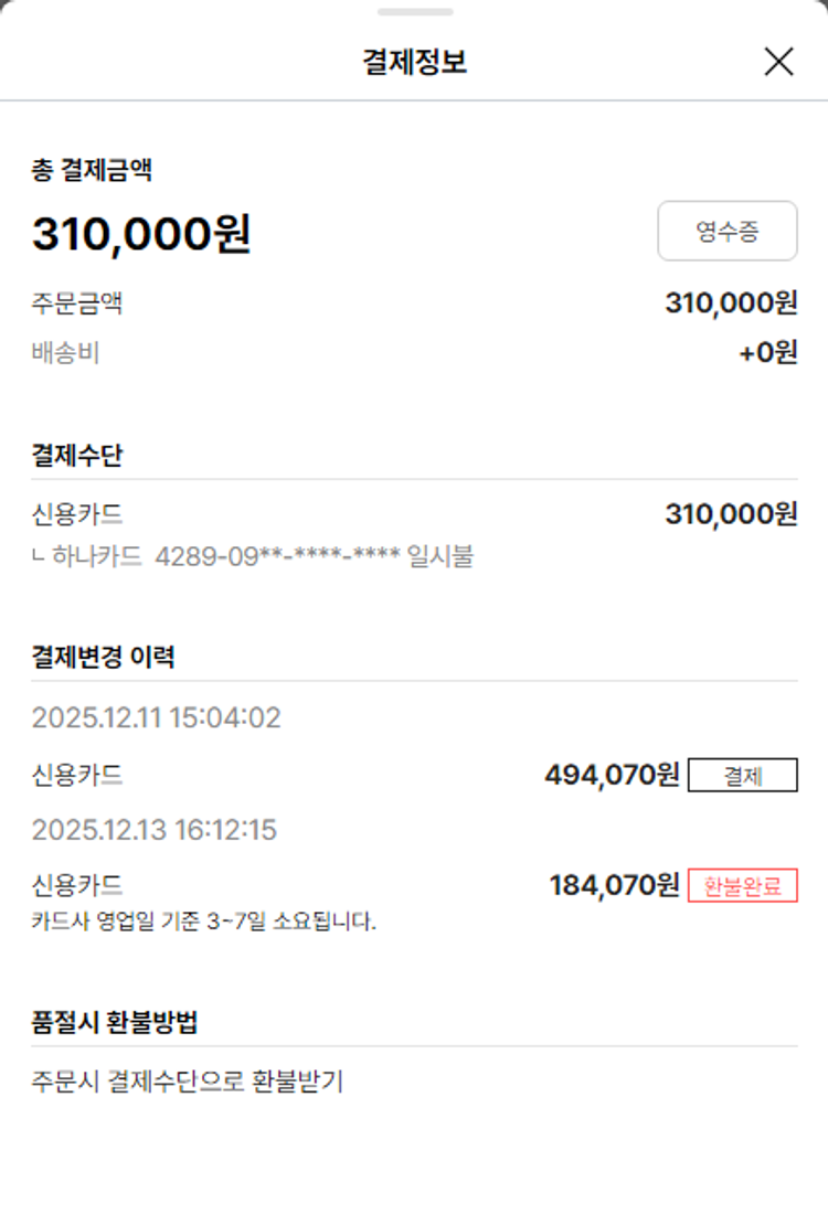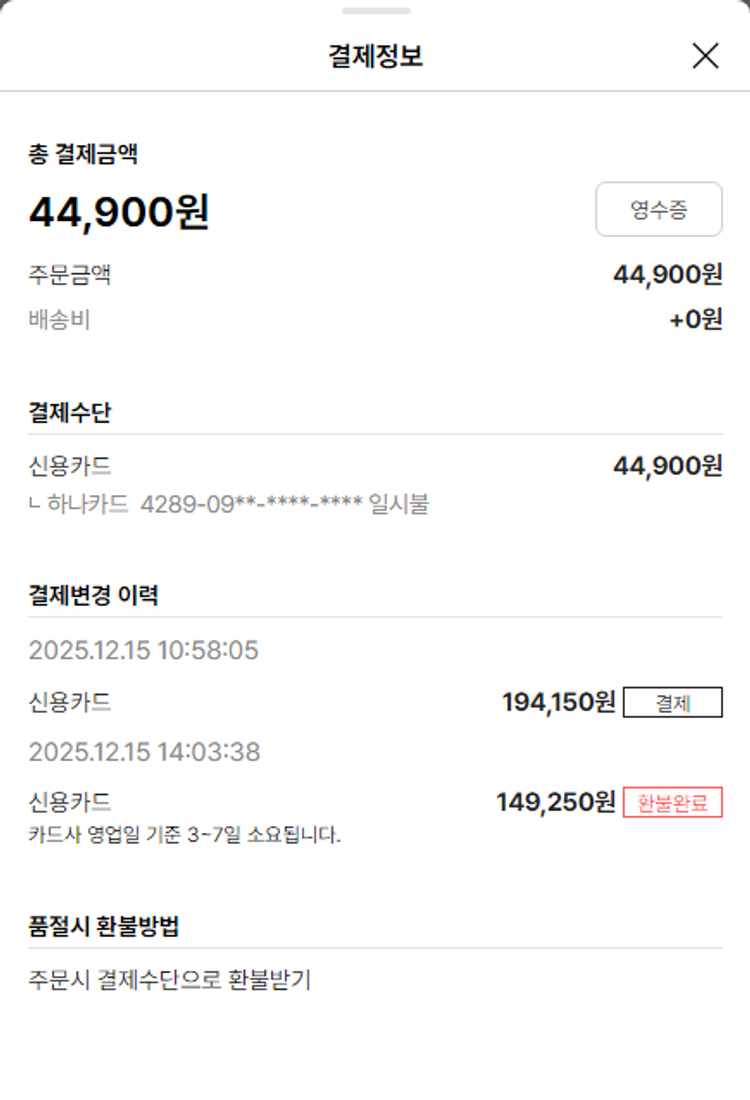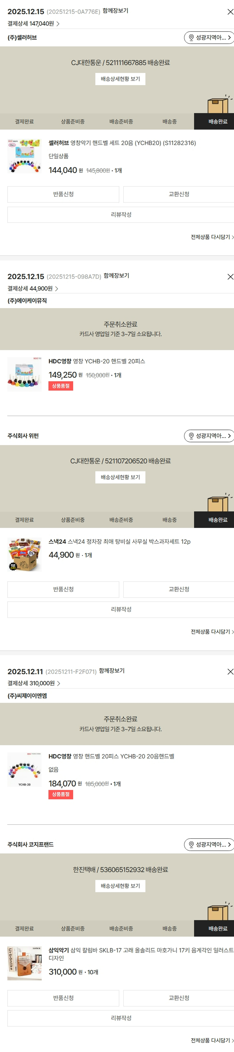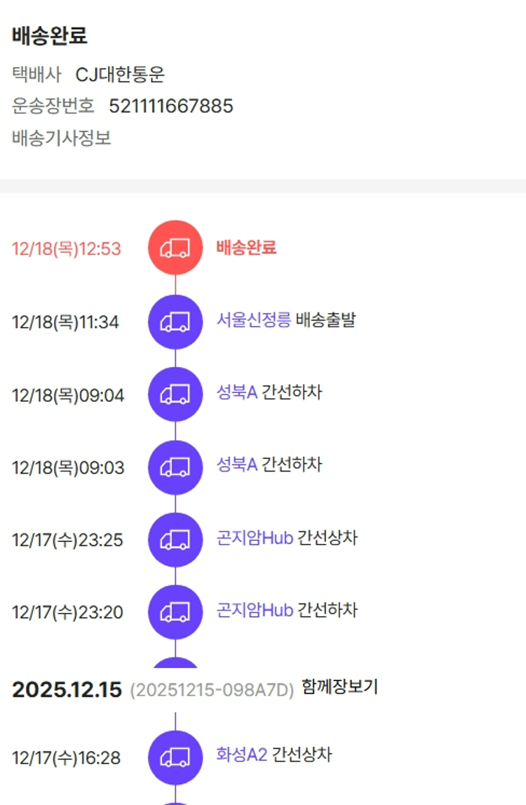 기부자님이 사용한 기부포인트 4,000원, 물품배송비 3,000원, 가격상승분 4,870원, 100원 미만 지원금 70원, 결제 수수료 10,837원, 기타 사업비는 행복나눔재단이 부담했습니다. (기부후기 발송시점에 최종 업데이트 됩니다.) 상품 주문 건 중 품절 발생하여 2025-12-15 재주문하였습니다. 실제 쇼핑몰에서 확인되는 배송현황을 캡처한 내용입니다. 실시간 자료와는 차이가 있을 수 있습니다.