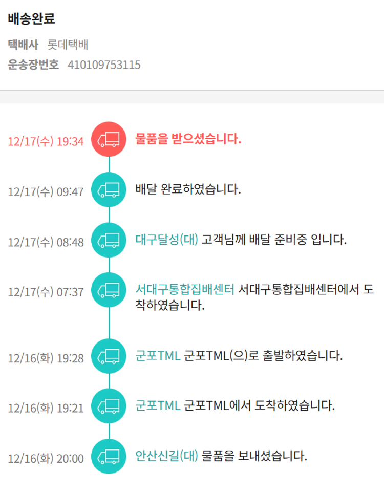 기부자님이 사용한 기부포인트 100원, 물품배송비 11,500원, 가격상승분 5,512원, 100원 미만 지원금 8원, 결제 수수료 10,529원, 기타 사업비는 행복나눔재단이 부담했습니다. (기부후기 발송시점에 최종 업데이트 됩니다.) 실제 쇼핑몰에서 확인되는 배송현황을 캡처한 내용입니다. 실시간 자료와는 차이가 있을 수 있습니다.