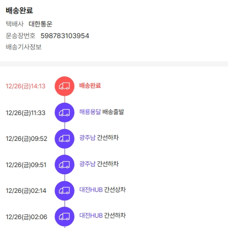 기부자님이 사용한 기부포인트 28,200원, 물품배송비 3,500원, 가격상승분 18,558원, 100원 미만 지원금 88원, 결제 수수료 11,933원, 기타 사업비는 행복나눔재단이 부담했습니다. (기부후기 발송시점에 최종 업데이트 됩니다.) 상품 주문 건 중 품절 발생하여 2025-12-24 재주문하였습니다. 실제 쇼핑몰에서 확인되는 배송현황을 캡처한 내용입니다. 실시간 자료와는 차이가 있을 수 있습니다.