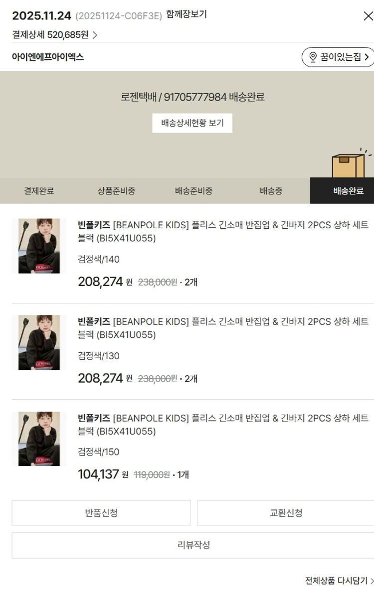 [BEANPOLE KIDS] 플리스 긴소매 반집업 & 긴바지 2PCS 상하 세트 블랙 (BI5X41U055)
