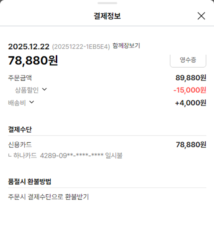 기부자님이 사용한 기부포인트 6,100원, 물품배송비 4,000원, 가격상승분 9,592원, 100원 미만 지원금 68원, 결제 수수료 11,577원, 기타 사업비는 행복나눔재단이 부담했습니다. (기부후기 발송시점에 최종 업데이트 됩니다.) 상품 주문 건 중 품절 발생하여 2025-12-22 재주문하였습니다. 실제 쇼핑몰에서 확인되는 배송현황을 캡처한 내용입니다. 실시간 자료와는 차이가 있을 수 있습니다.