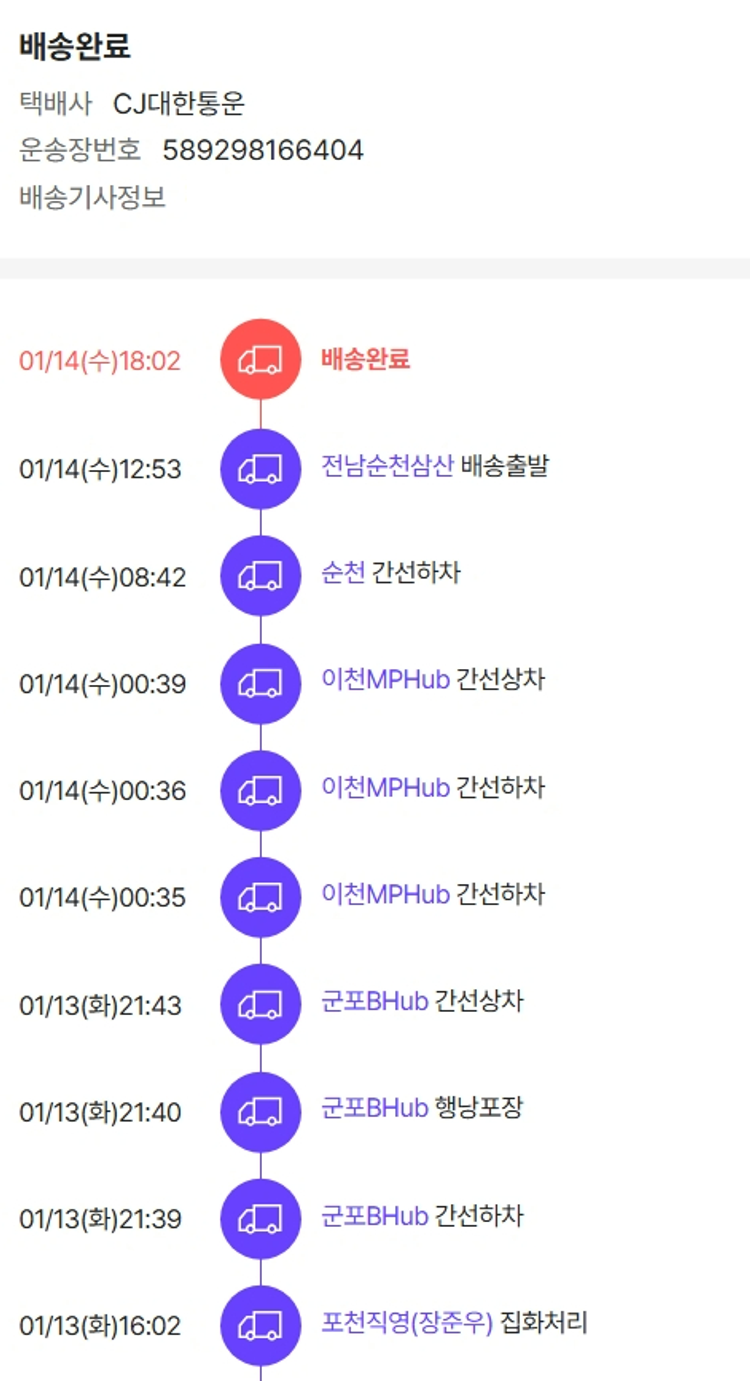 물품배송비 12,000원, 가격상승분 5,850원, 100원 미만 지원금 70원, 기타 사업비는 행복나눔재단이 부담했습니다. (기부후기 발송시점에 최종 업데이트 됩니다.) 상품 주문 건 중 품절 발생하여 2026-01-13 재주문하였습니다. 실제 쇼핑몰에서 확인되는 배송현황을 캡처한 내용입니다. 실시간 자료와는 차이가 있을 수 있습니다.