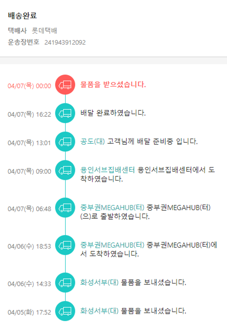기부자님이 사용한 기부포인트 20,200원, 물품배송비 5,500원, 가격상승분 240원, 결제 수수료 7,799원, 기타 사업비는 행복나눔재단이 부담했습니다. (기부후기 발송시점에 최종 업데이트 됩니다.) 실제 쇼핑몰에서 확인되는 배송현황을 캡처한 내용입니다. 실시간 자료와는 차이가 있을 수 있습니다.