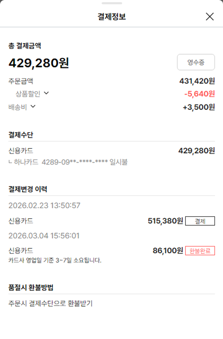 물품배송비 3,500원, 가격상승분 4,490원, 100원 미만 지원금 60원, 결제 수수료 10,985원, 기타 사업비는 행복나눔재단이 부담했습니다. (기부후기 발송시점에 최종 업데이트 됩니다.) 상품 주문 건 중 품절 발생하여 2026-03-04 재주문하였습니다. 실제 쇼핑몰에서 확인되는 배송현황을 캡처한 내용입니다. 실시간 자료와는 차이가 있을 수 있습니다.