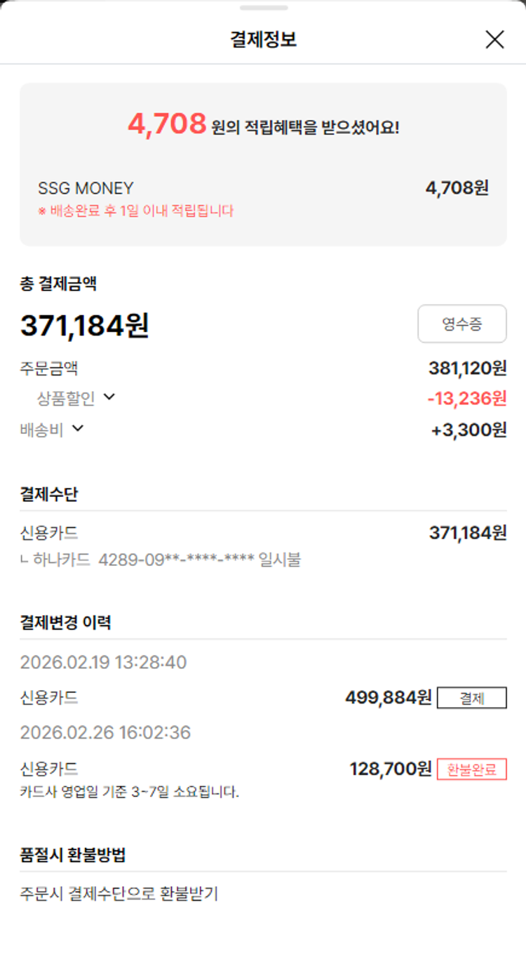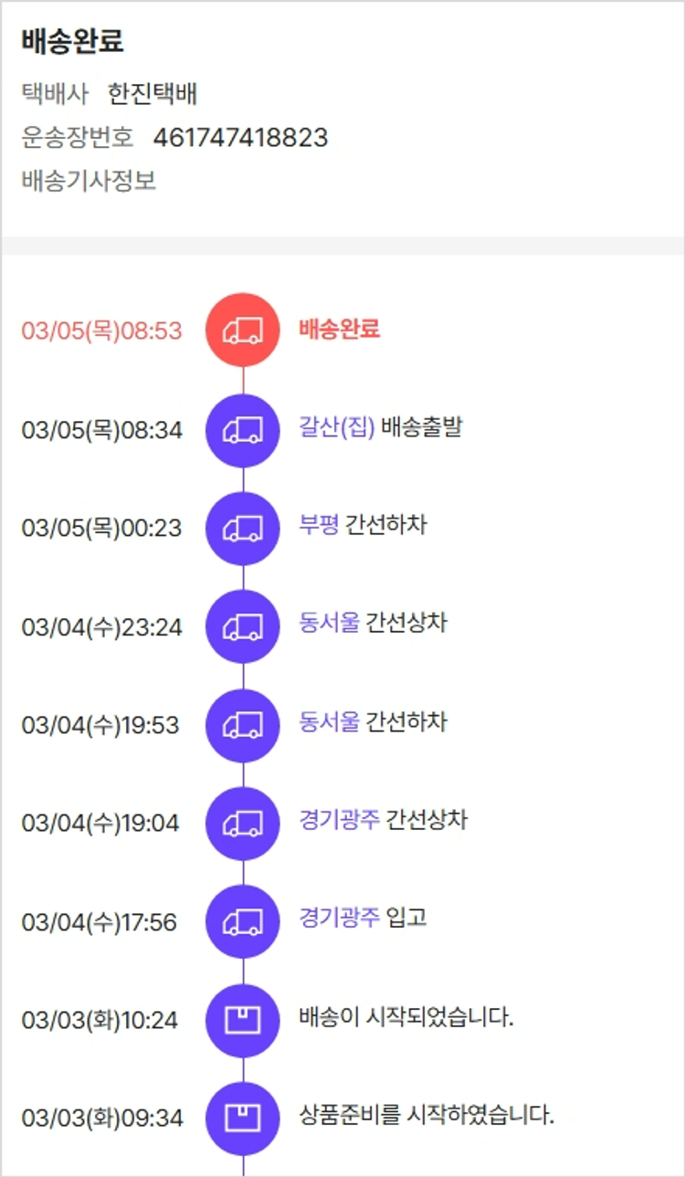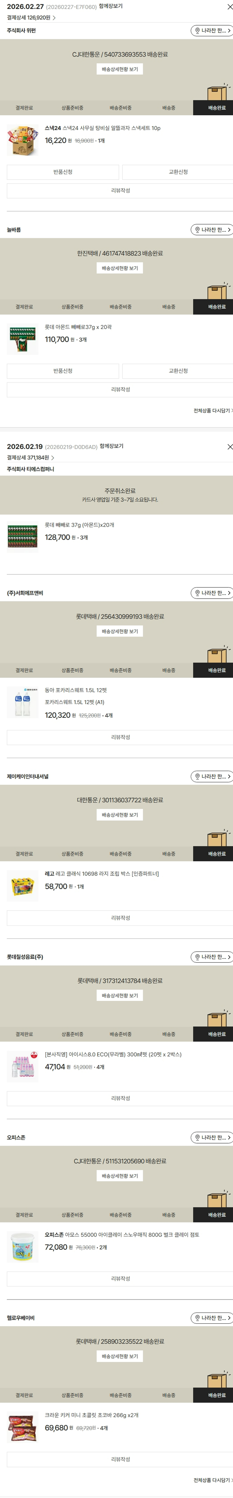 기부자님이 사용한 기부포인트 10,500원, 물품배송비 3,300원, 가격상승분 1,615원, 100원 미만 지원금 89원, 결제 수수료 14,454원, 기타 사업비는 행복나눔재단이 부담했습니다. (기부후기 발송시점에 최종 업데이트 됩니다.) 상품 주문 건 중 품절 발생하여 2026-02-27 재주문하였습니다. 실제 쇼핑몰에서 확인되는 배송현황을 캡처한 내용입니다. 실시간 자료와는 차이가 있을 수 있습니다.