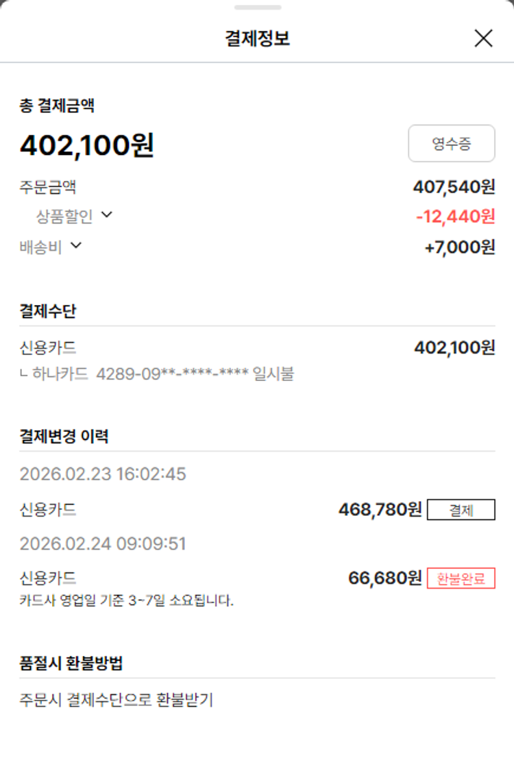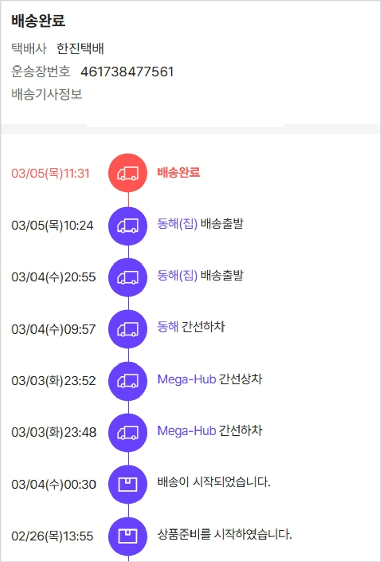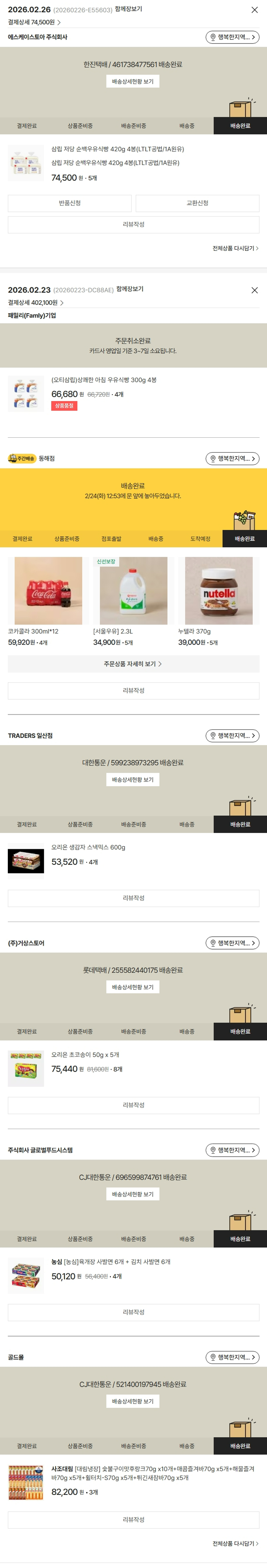 기부자님이 사용한 기부포인트 14,500원, 물품배송비 7,000원, 가격상승분 8,900원, 결제 수수료 12,965원, 기타 사업비는 행복나눔재단이 부담했습니다. (기부후기 발송시점에 최종 업데이트 됩니다.) 상품 주문 건 중 품절 발생하여 2026-02-26 재주문하였습니다. 실제 쇼핑몰에서 확인되는 배송현황을 캡처한 내용입니다. 실시간 자료와는 차이가 있을 수 있습니다.