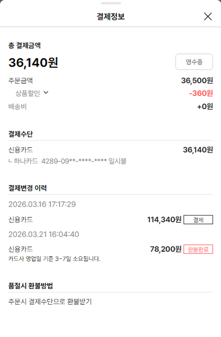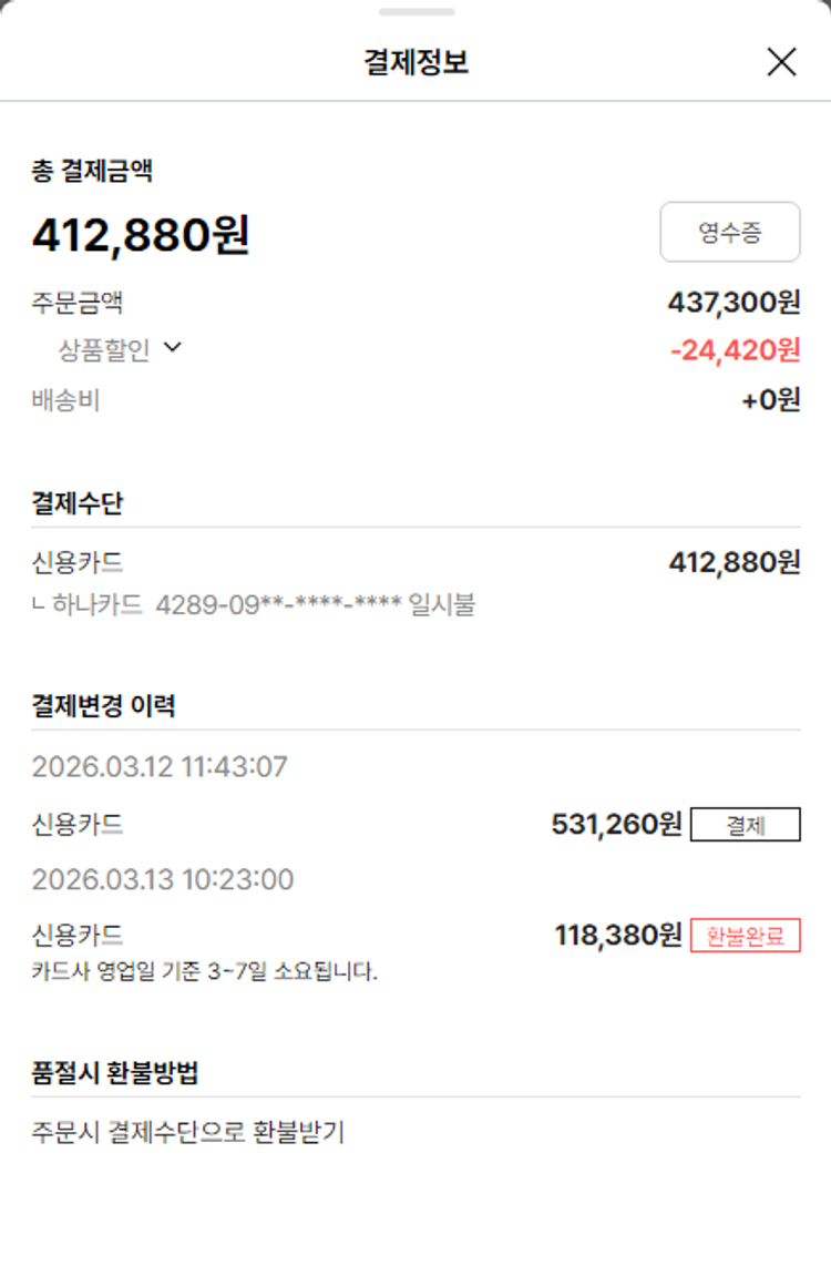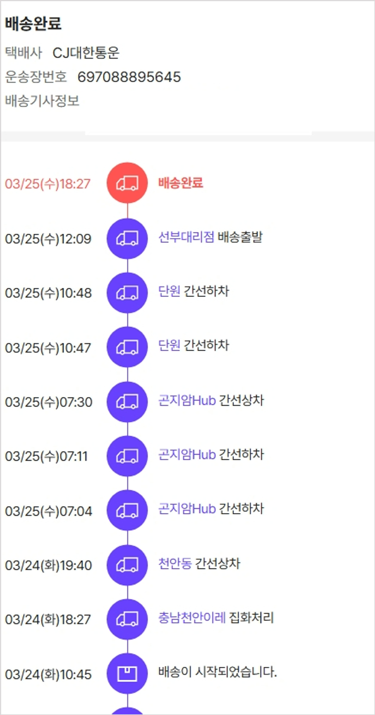 가격상승분 11,220원, 100원 미만 지원금 60원, 결제 수수료 11,535원, 기타 사업비는 행복나눔재단이 부담했습니다. (기부후기 발송시점에 최종 업데이트 됩니다.) 상품 주문 건 중 품절 발생하여 2026-03-23 재주문하였습니다. 실제 쇼핑몰에서 확인되는 배송현황을 캡처한 내용입니다. 실시간 자료와는 차이가 있을 수 있습니다.