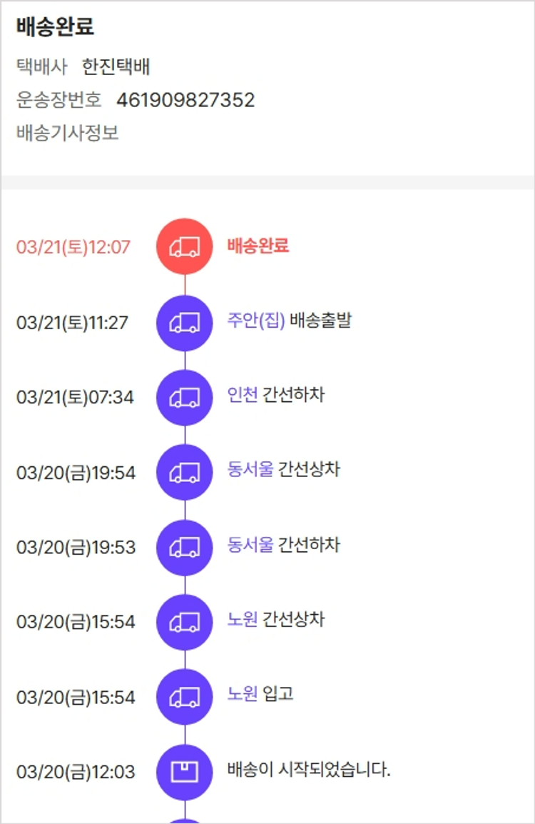 기부자님이 사용한 기부포인트 1,000원, 가격상승분 4,290원, 100원 미만 지원금 30원, 결제 수수료 10,507원, 기타 사업비는 행복나눔재단이 부담했습니다. (기부후기 발송시점에 최종 업데이트 됩니다.) 상품 주문 건 중 품절 발생하여 2026-03-19 재주문하였습니다. 실제 쇼핑몰에서 확인되는 배송현황을 캡처한 내용입니다. 실시간 자료와는 차이가 있을 수 있습니다.