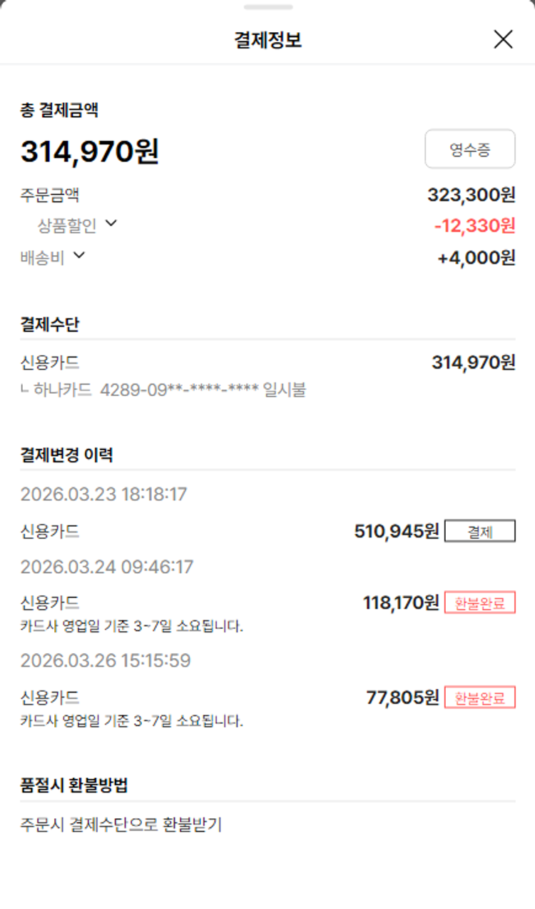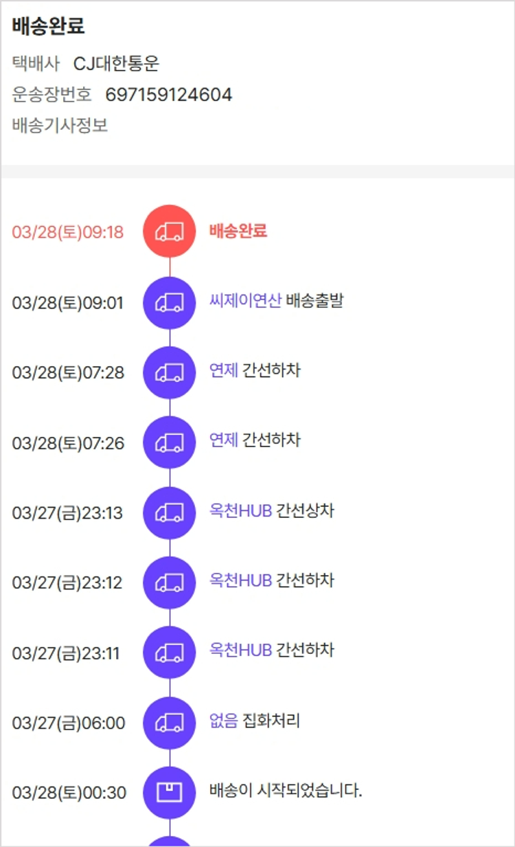 기부자님이 사용한 기부포인트 17,000원, 물품배송비 4,000원, 가격상승분 7,285원, 100원 미만 지원금 85원, 결제 수수료 10,919원, 기타 사업비는 행복나눔재단이 부담했습니다. (기부후기 발송시점에 최종 업데이트 됩니다.) 상품 주문 건 중 품절 발생하여 2026-03-26 재주문하였습니다. 실제 쇼핑몰에서 확인되는 배송현황을 캡처한 내용입니다. 실시간 자료와는 차이가 있을 수 있습니다.