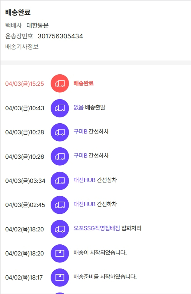 기부자님이 사용한 기부포인트 26,500원, 가격상승분 2,880원, 100원 미만 지원금 90원, 결제 수수료 11,816원, 기타 사업비는 행복나눔재단이 부담했습니다. (기부후기 발송시점에 최종 업데이트 됩니다.) 실제 쇼핑몰에서 확인되는 배송현황을 캡처한 내용입니다. 실시간 자료와는 차이가 있을 수 있습니다.