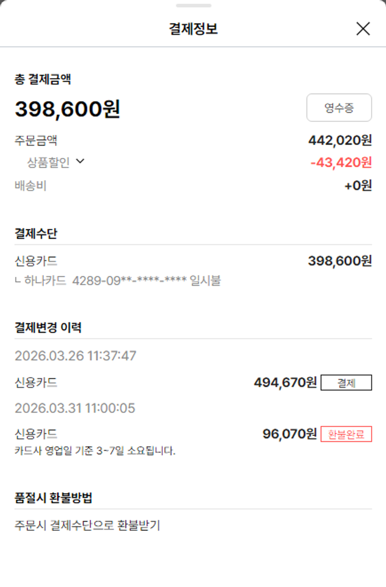 기부자님이 사용한 기부포인트 5,500원, 가격상승분 5,966원, 100원 미만 지원금 34원, 결제 수수료 11,324원, 기타 사업비는 행복나눔재단이 부담했습니다. (기부후기 발송시점에 최종 업데이트 됩니다.) 상품 주문 건 중 품절 발생하여 2026-04-02 재주문하였습니다. 실제 쇼핑몰에서 확인되는 배송현황을 캡처한 내용입니다. 실시간 자료와는 차이가 있을 수 있습니다.