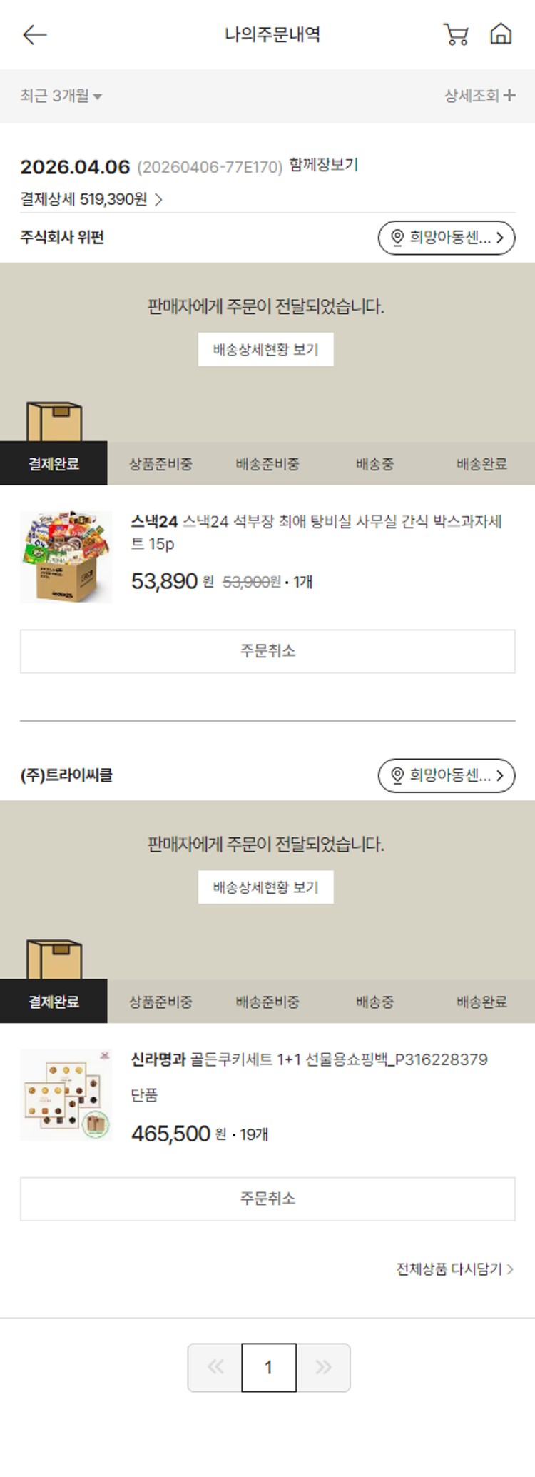 기부자님이 사용한 기부포인트 13,500원, 가격상승분 1,640원, 100원 미만 지원금 50원, 결제 수수료 11,556원, 기타 사업비는 행복나눔재단이 부담했습니다. (기부후기 발송시점에 최종 업데이트 됩니다.) 실제 쇼핑몰에서 확인되는 배송현황을 캡처한 내용입니다. 실시간 자료와는 차이가 있을 수 있습니다.