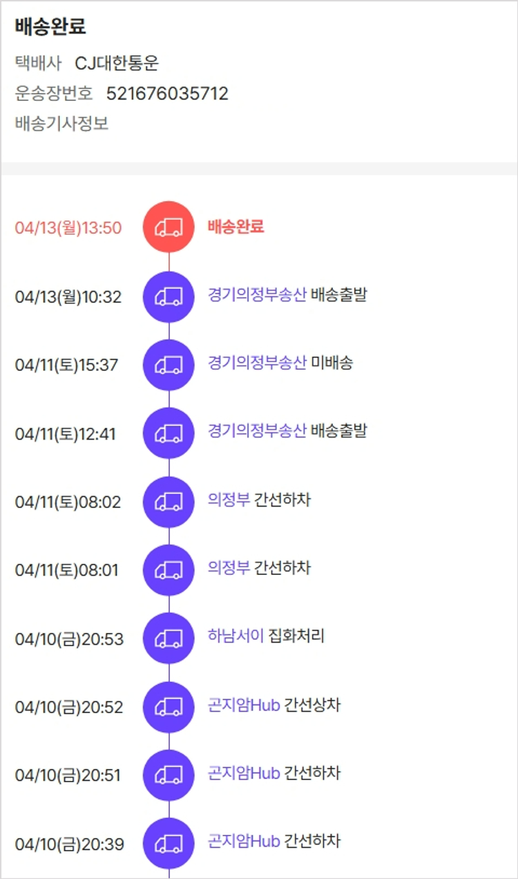 물품배송비 3,000원, 가격상승분 2,790원, 100원 미만 지원금 40원, 결제 수수료 7,652원, 기타 사업비는 행복나눔재단이 부담했습니다. (기부후기 발송시점에 최종 업데이트 됩니다.) 상품 주문 건 중 품절 발생하여 2026-04-09 재주문하였습니다. 실제 쇼핑몰에서 확인되는 배송현황을 캡처한 내용입니다. 실시간 자료와는 차이가 있을 수 있습니다.