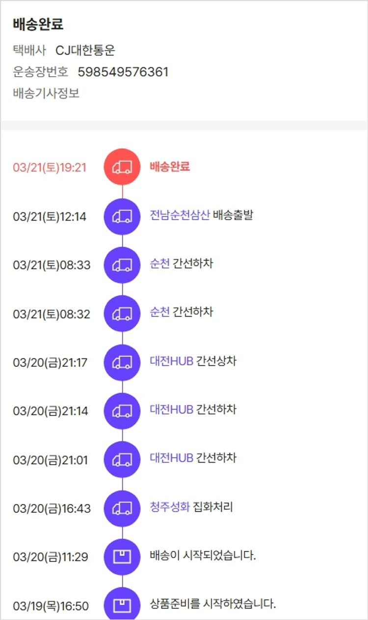 기부자님이 사용한 기부포인트 11,500원, 물품배송비 6,000원, 가격상승분 8,838원, 100원 미만 지원금 82원, 결제 수수료 14,719원, 기타 사업비는 행복나눔재단이 부담했습니다. (기부후기 발송시점에 최종 업데이트 됩니다.) 상품 주문 건 중 품절 발생하여 2026-03-19 재주문하였습니다. 실제 쇼핑몰에서 확인되는 배송현황을 캡처한 내용입니다. 실시간 자료와는 차이가 있을 수 있습니다.