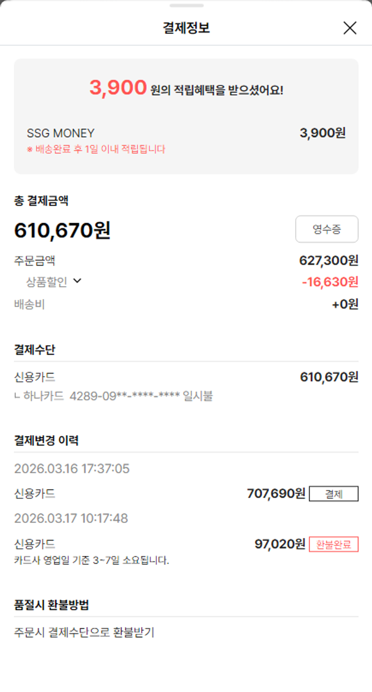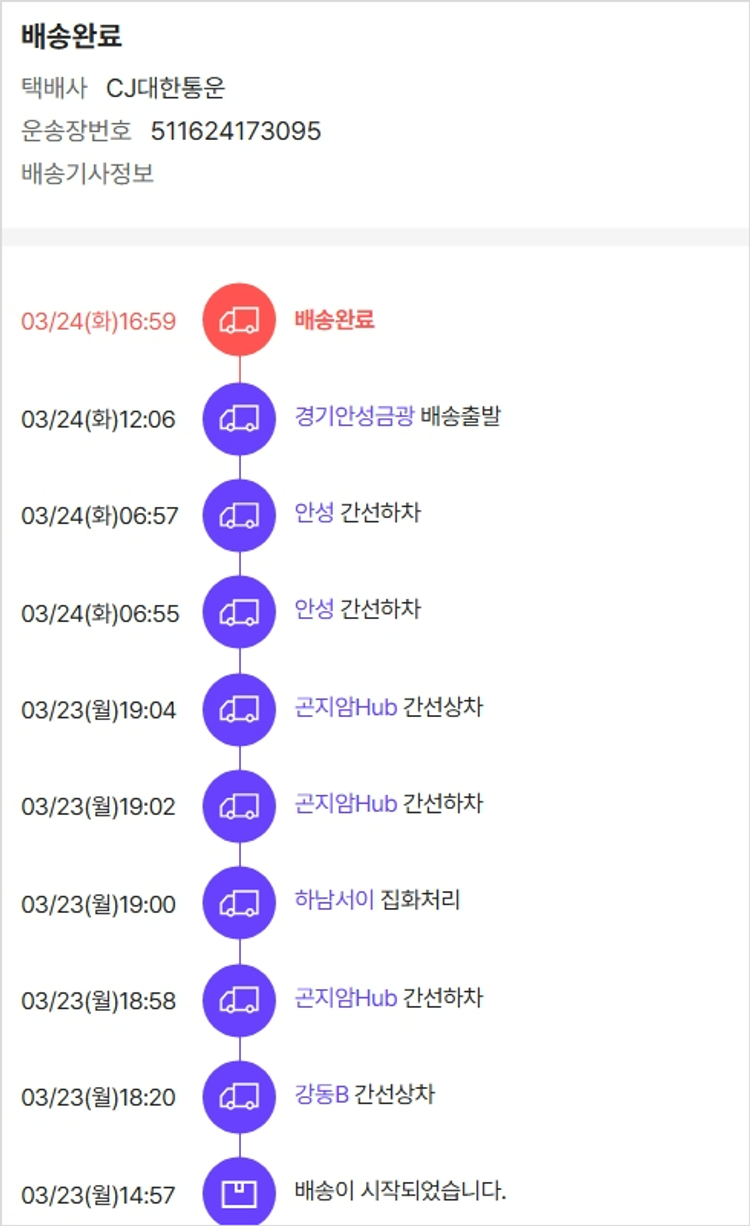 가격상승분 3,147원, 100원 미만 지원금 90원, 결제 수수료 22,886원, 기타 사업비는 행복나눔재단이 부담했습니다. (기부후기 발송시점에 최종 업데이트 됩니다.) 상품 주문 건 중 품절 발생하여 2026-03-23 재주문하였습니다. 실제 쇼핑몰에서 확인되는 배송현황을 캡처한 내용입니다. 실시간 자료와는 차이가 있을 수 있습니다.