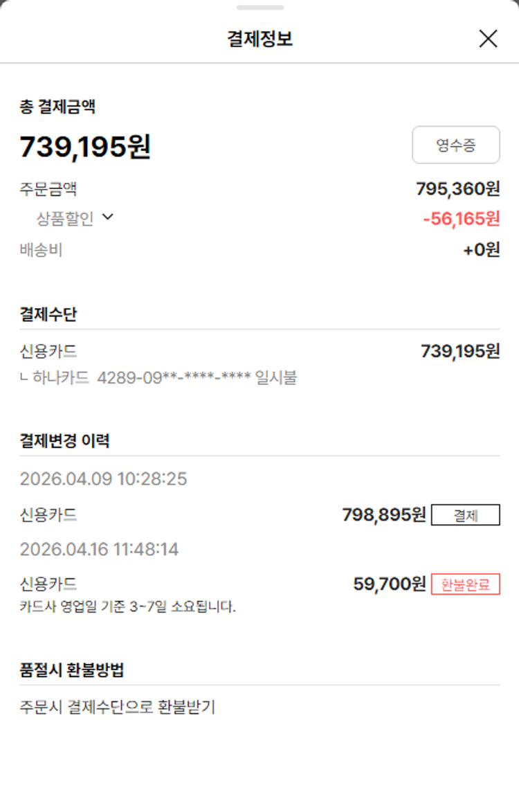 기부자님이 사용한 기부포인트 10,500원, 가격상승분 4,697원, 100원 미만 지원금 38원, 결제 수수료 22,784원, 기타 사업비는 행복나눔재단이 부담했습니다. (기부후기 발송시점에 최종 업데이트 됩니다.) 상품 주문 건 중 품절 발생하여 2026-04-16 재주문하였습니다. 실제 쇼핑몰에서 확인되는 배송현황을 캡처한 내용입니다. 실시간 자료와는 차이가 있을 수 있습니다.