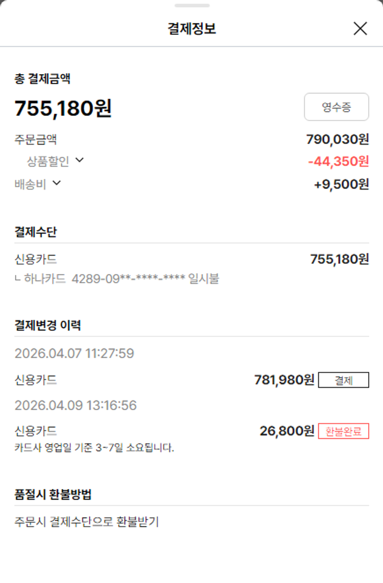 기부자님이 사용한 기부포인트 4,000원, 물품배송비 9,500원, 가격상승분 11,490원, 100원 미만 지원금 90원, 결제 수수료 16,171원, 기타 사업비는 행복나눔재단이 부담했습니다. (기부후기 발송시점에 최종 업데이트 됩니다.) 상품 주문 건 중 품절 발생하여 2026-04-09 재주문하였습니다. 실제 쇼핑몰에서 확인되는 배송현황을 캡처한 내용입니다. 실시간 자료와는 차이가 있을 수 있습니다.
