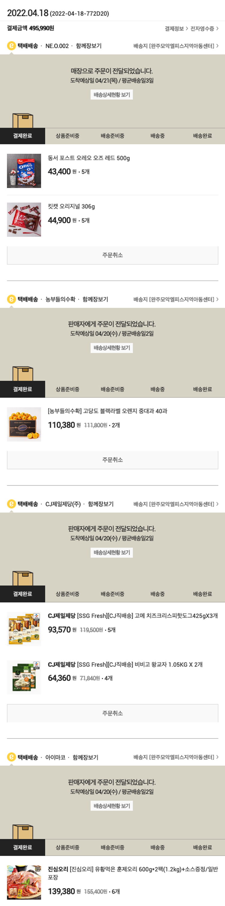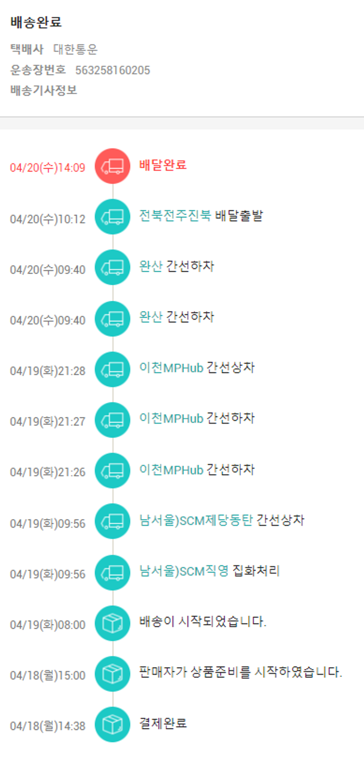 기부자님이 사용한 기부포인트 45,400원, 가격상승분 150원, 100원 미만 지원금 40원, 결제 수수료 11,671원, 기타 사업비는 행복나눔재단이 부담했습니다. (기부후기 발송시점에 최종 업데이트 됩니다.) 실제 쇼핑몰에서 확인되는 배송현황을 캡처한 내용입니다. 실시간 자료와는 차이가 있을 수 있습니다.