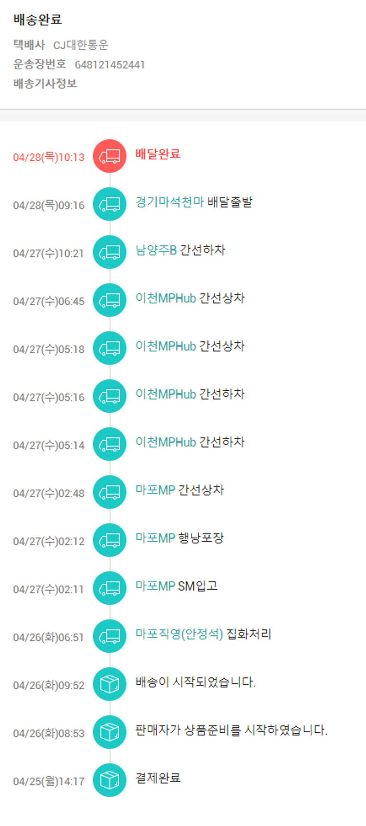 기부자님이 사용한 기부포인트 38,600원, 가격상승분 3,587원, 100원 미만 지원금 26원, 결제 수수료 10,297원, 기타 사업비는 행복나눔재단이 부담했습니다. (기부후기 발송시점에 최종 업데이트 됩니다.) 실제 쇼핑몰에서 확인되는 배송현황을 캡처한 내용입니다. 실시간 자료와는 차이가 있을 수 있습니다.