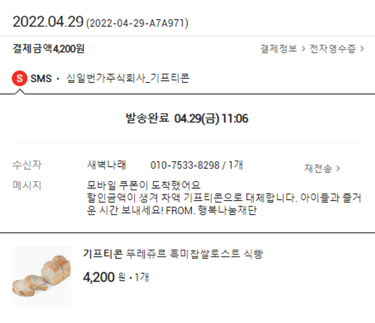 기부자님이 사용한 기부포인트 52,600원, 물품배송비 5,500원, 가격상승분 160원, 100원 미만 지원금 70원, 결제 수수료 9,312원, 기타 사업비는 행복나눔재단이 부담했습니다. (기부후기 발송시점에 최종 업데이트 됩니다.) 실제 쇼핑몰에서 확인되는 배송현황을 캡처한 내용입니다. 실시간 자료와는 차이가 있을 수 있습니다.
