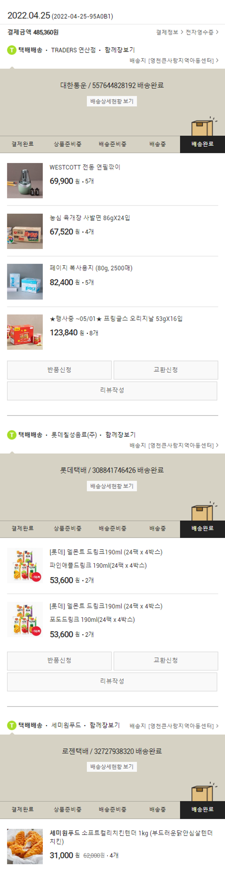 물품배송비 3,500원, 100원 미만 지원금 60원, 결제 수수료 9,010원, 기타 사업비는 행복나눔재단이 부담했습니다. (기부후기 발송시점에 최종 업데이트 됩니다.) 실제 쇼핑몰에서 확인되는 배송현황을 캡처한 내용입니다. 실시간 자료와는 차이가 있을 수 있습니다.