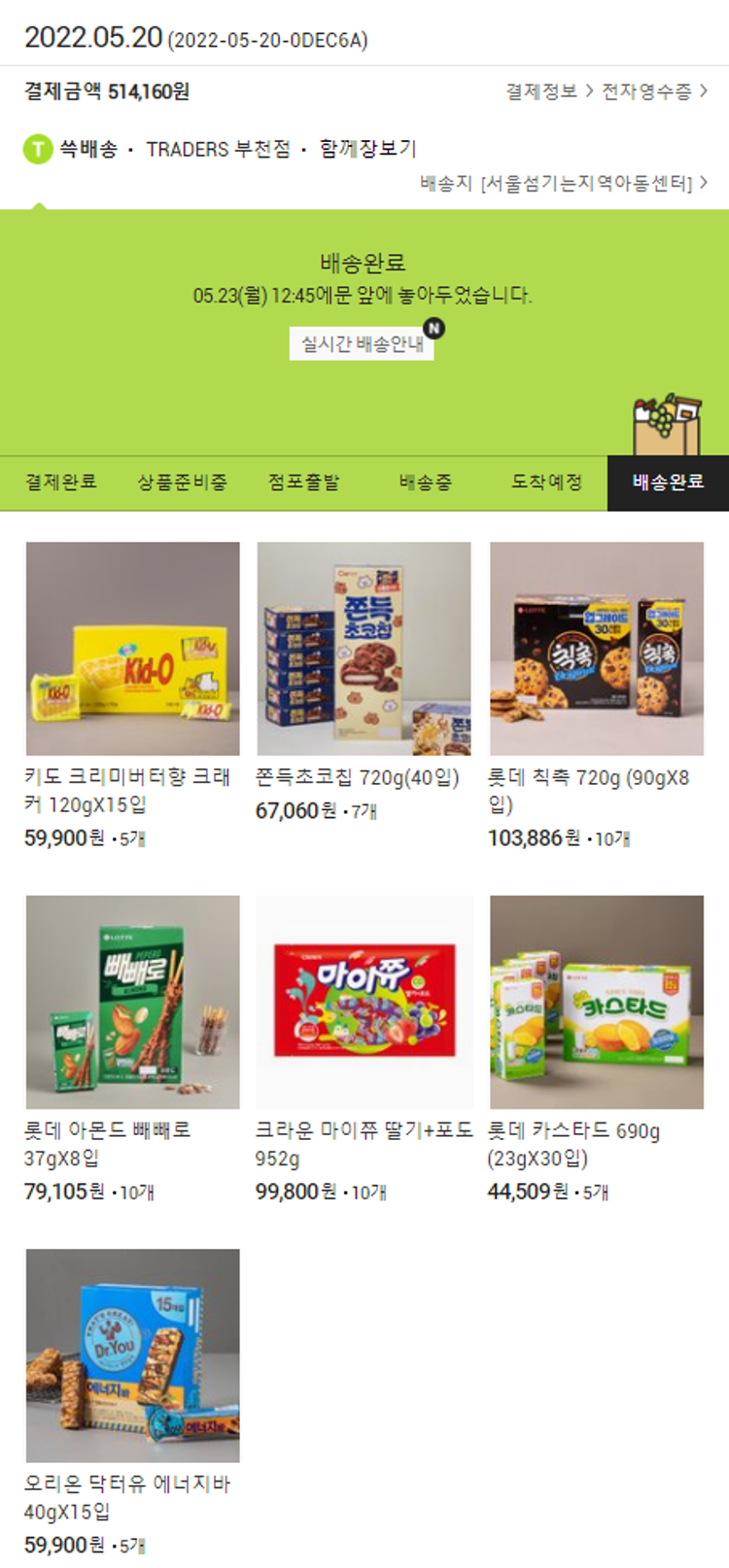 기부자님이 사용한 기부포인트 50,000원, 가격상승분 18,000원, 100원 미만 지원금 60원, 결제 수수료 8,769원, 기타 사업비는 행복나눔재단이 부담했습니다. (기부후기 발송시점에 최종 업데이트 됩니다.) 실제 쇼핑몰에서 확인되는 배송현황을 캡처한 내용입니다. 실시간 자료와는 차이가 있을 수 있습니다.