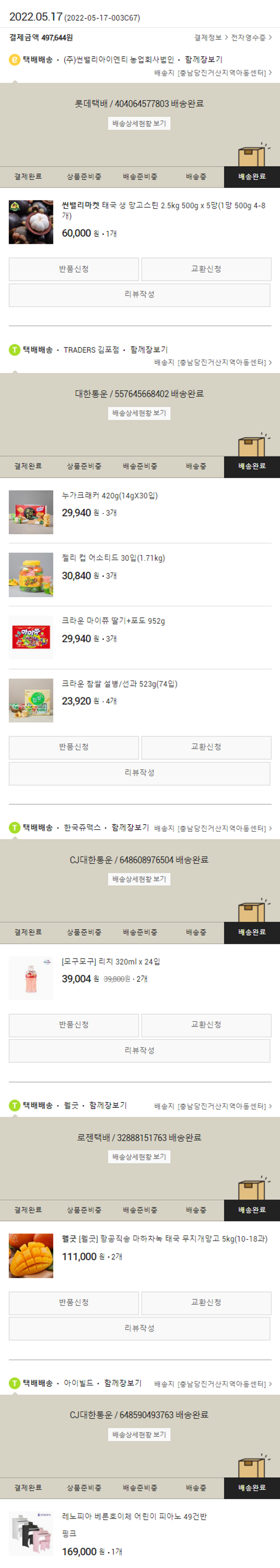 기부자님이 사용한 기부포인트 57,500원, 물품배송비 4,000원, 가격상승분 682원, 100원 미만 지원금 62원, 결제 수수료 9,299원, 기타 사업비는 행복나눔재단이 부담했습니다. (기부후기 발송시점에 최종 업데이트 됩니다.) 실제 쇼핑몰에서 확인되는 배송현황을 캡처한 내용입니다. 실시간 자료와는 차이가 있을 수 있습니다.