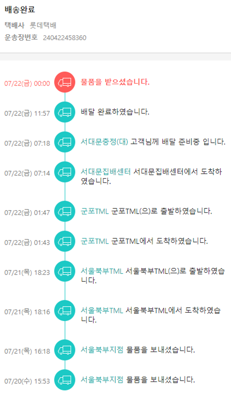 기부자님이 사용한 기부포인트 45,500원, 가격상승분 2,560원, 100원 미만 지원금 40원, 결제 수수료 8,798원, 기타 사업비는 행복나눔재단이 부담했습니다. (기부후기 발송시점에 최종 업데이트 됩니다.) 실제 쇼핑몰에서 확인되는 배송현황을 캡처한 내용입니다. 실시간 자료와는 차이가 있을 수 있습니다.