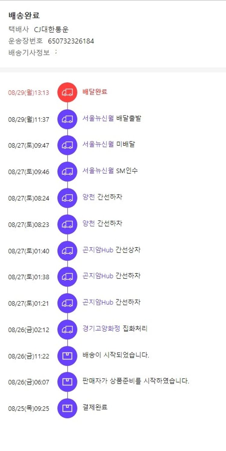 기부자님이 사용한 기부포인트 22,550원, 결제 수수료 14,476원, 기타 사업비는 행복나눔재단이 부담했습니다. (기부후기 발송시점에 최종 업데이트 됩니다.) 실제 쇼핑몰에서 확인되는 배송현황을 캡처한 내용입니다. 실시간 자료와는 차이가 있을 수 있습니다.