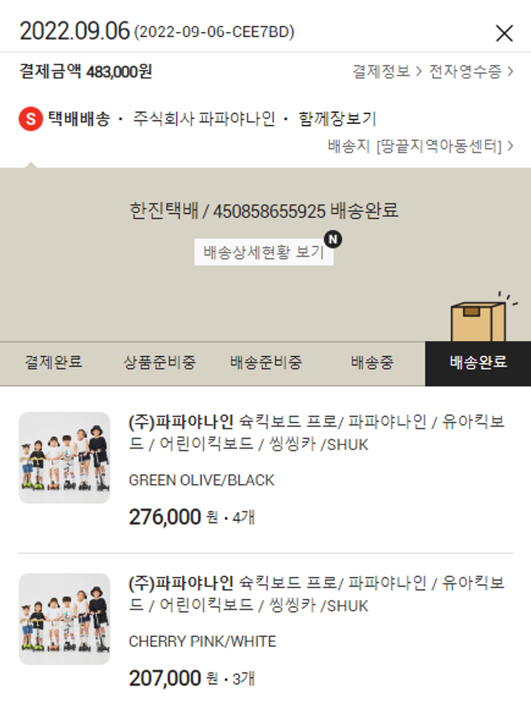 기부자님이 사용한 기부포인트 12,000원, 결제 수수료 14,352원, 기타 사업비는 행복나눔재단이 부담했습니다. (기부후기 발송시점에 최종 업데이트 됩니다.) 실제 쇼핑몰에서 확인되는 배송현황을 캡처한 내용입니다. 실시간 자료와는 차이가 있을 수 있습니다.