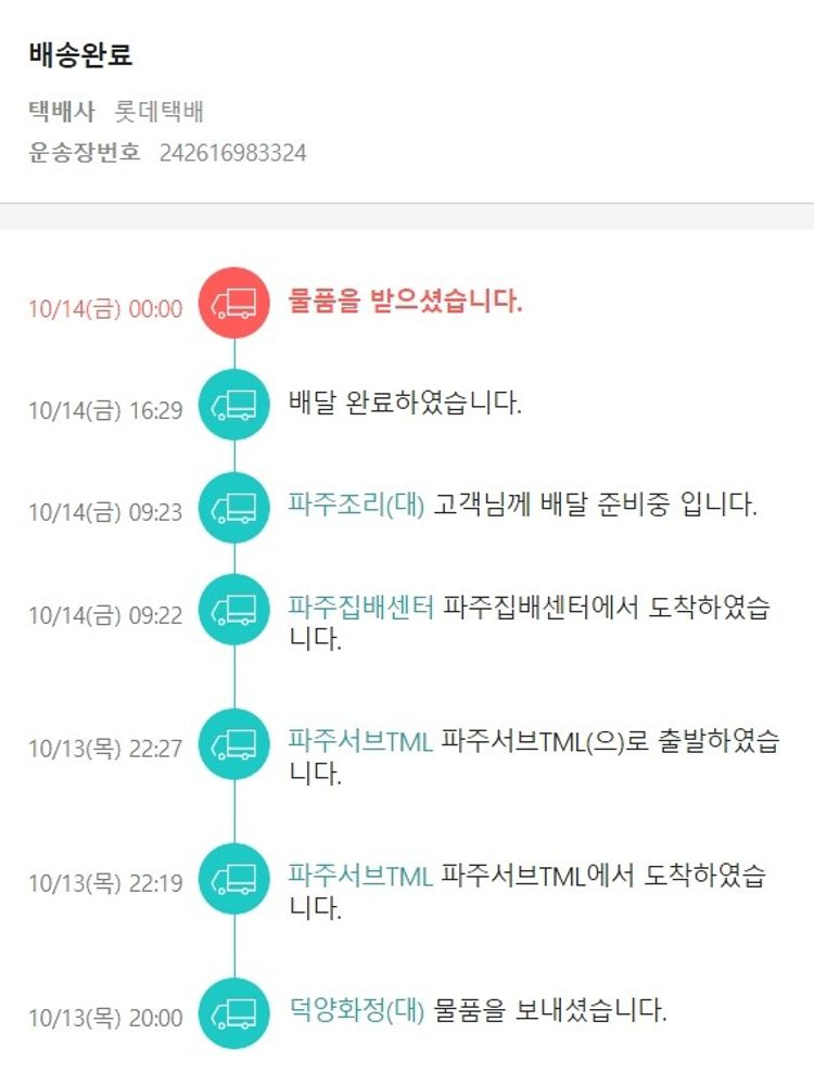 기부자님이 사용한 기부포인트 13,500원, 물품배송비 2,500원, 100원 미만 지원금 68원, 결제 수수료 11,832원, 기타 사업비는 행복나눔재단이 부담했습니다. (기부후기 발송시점에 최종 업데이트 됩니다.) 실제 쇼핑몰에서 확인되는 배송현황을 캡처한 내용입니다. 실시간 자료와는 차이가 있을 수 있습니다.