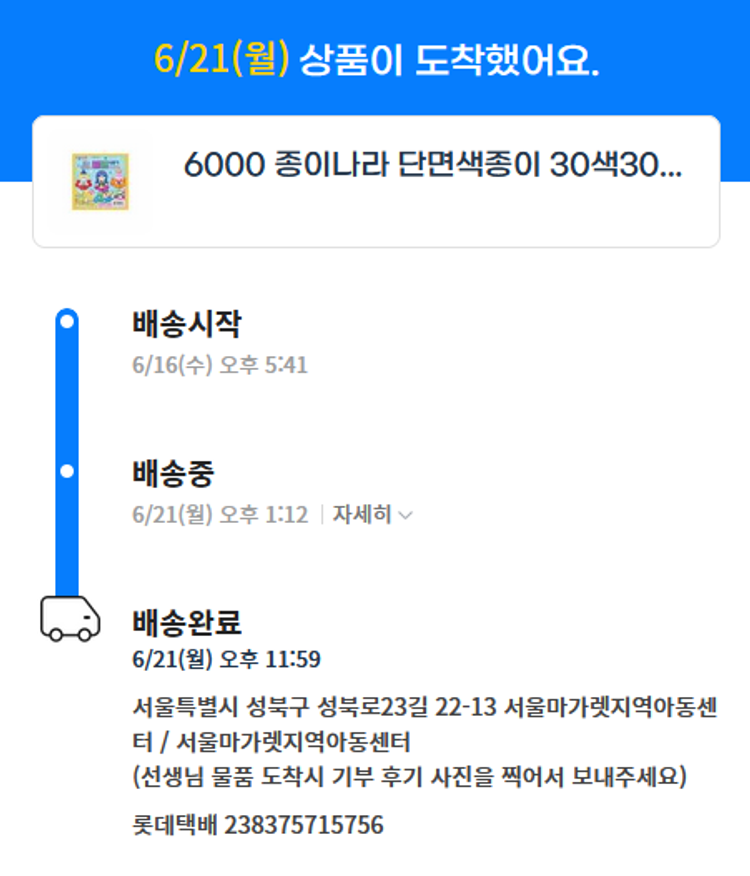 기부자님이 사용한 기부포인트 53,500원, 물품배송비 5,000원, 가격상승분 110원, 100원 미만 지원금 20원, 결제 수수료 10,309원, 기타 사업비는 행복나눔재단이 부담했습니다. (기부후기 발송시점에 최종 업데이트 됩니다.) 실제 쇼핑몰에서 확인되는 배송현황을 캡처한 내용입니다. 실시간 자료와는 차이가 있을 수 있습니다.