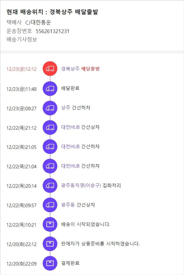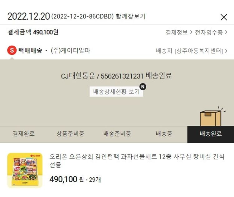 기부자님이 사용한 기부포인트 6,000원, 결제 수수료 12,516원, 기타 사업비는 행복나눔재단이 부담했습니다. (기부후기 발송시점에 최종 업데이트 됩니다.) 실제 쇼핑몰에서 확인되는 배송현황을 캡처한 내용입니다. 실시간 자료와는 차이가 있을 수 있습니다.