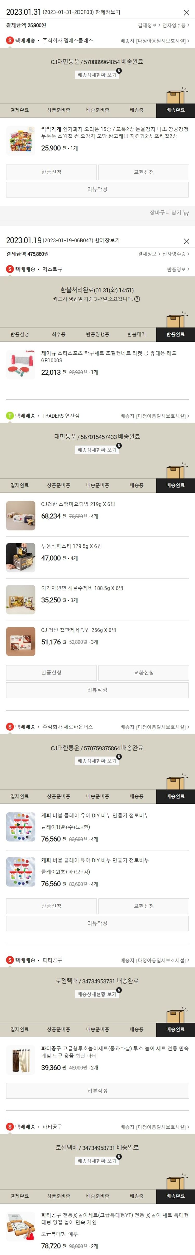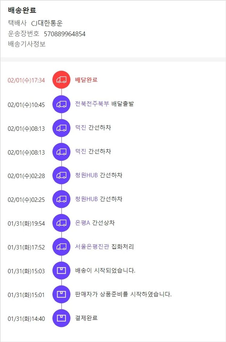 기부자님이 사용한 기부포인트 16,800원, 물품배송비 3,000원, 가격상승분 8,321원, 100원 미만 지원금 39원, 결제 수수료 12,417원, 기타 사업비는 행복나눔재단이 부담했습니다. (기부후기 발송시점에 최종 업데이트 됩니다.) 주문완료건중 품절건이 발생하여 23.01.31. 재주문하였습니다. 실제 쇼핑몰에서 확인되는 배송현황을 캡처한 내용입니다. 실시간 자료와는 차이가 있을 수 있습니다.