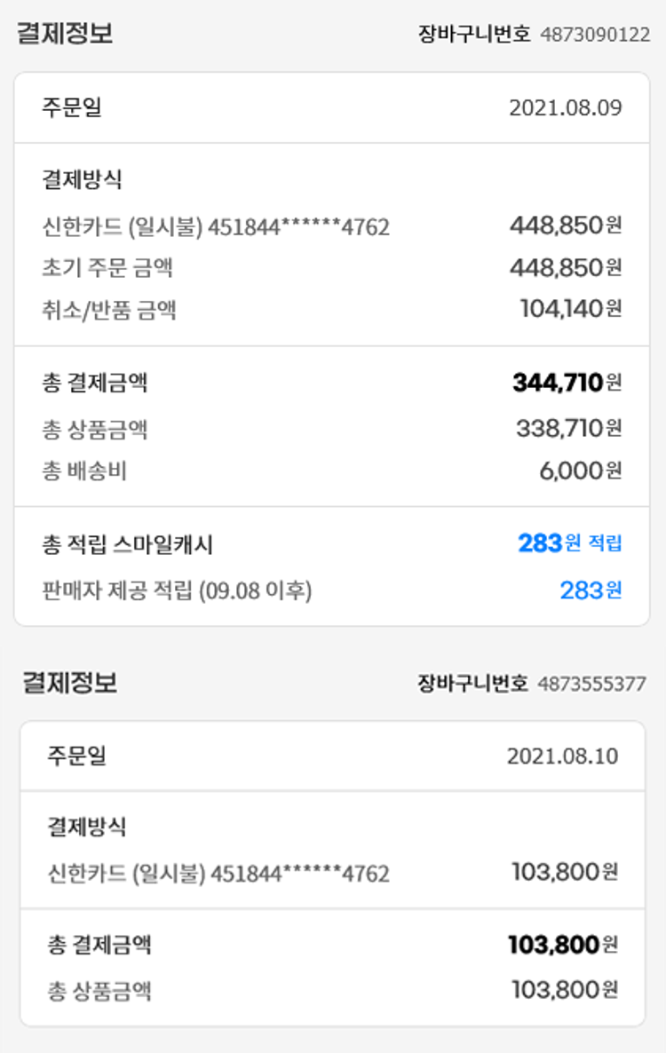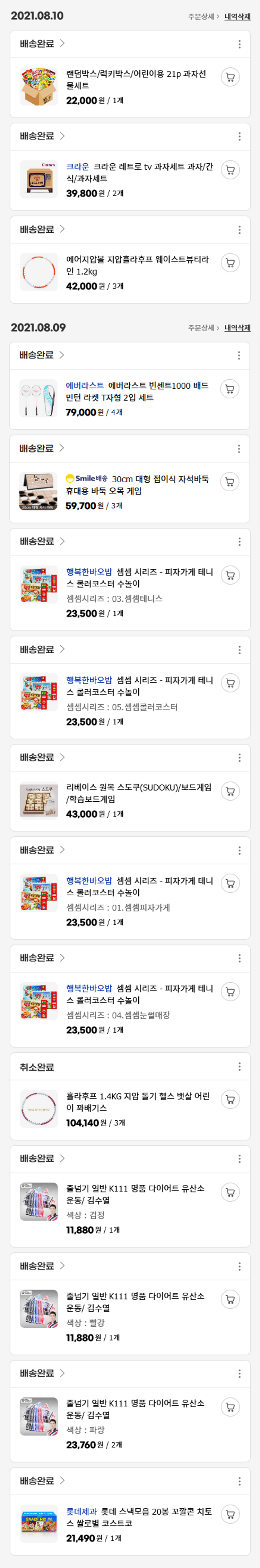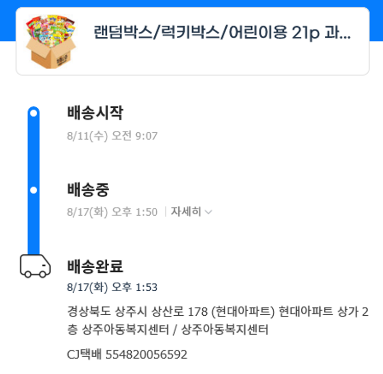 기부자님이 사용한 기부포인트 43,500원, 물품배송비 6,000원, 가격상승분 2,160원, 100원 미만 지원금 50원, 결제 수수료 10,624원, 기타 사업비는 행복나눔재단이 부담했습니다. (기부후기 발송시점에 최종 업데이트 됩니다.) 실제 쇼핑몰에서 확인되는 배송현황을 캡처한 내용입니다. 실시간 자료와는 차이가 있을 수 있습니다.