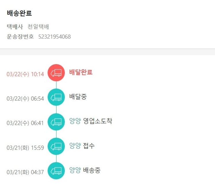 기부자님이 사용한 기부포인트 5,300원, 물품배송비 9,000원, 가격상승분 4,500원, 100원 미만 지원금 10원, 결제 수수료 13,291원, 기타 사업비는 행복나눔재단이 부담했습니다. (기부후기 발송시점에 최종 업데이트 됩니다.) 주문 건 중 품절 건 발생하여 2023. 03. 17. 재주문하였습니다. 실제 쇼핑몰에서 확인되는 배송현황을 캡처한 내용입니다. 실시간 자료와는 차이가 있을 수 있습니다.