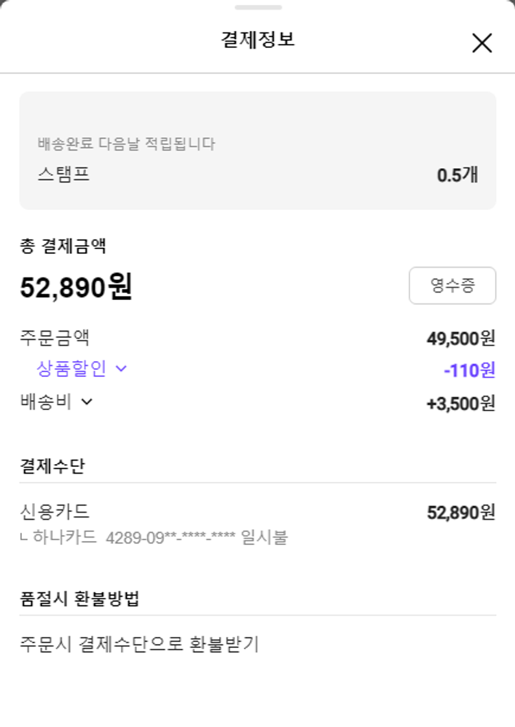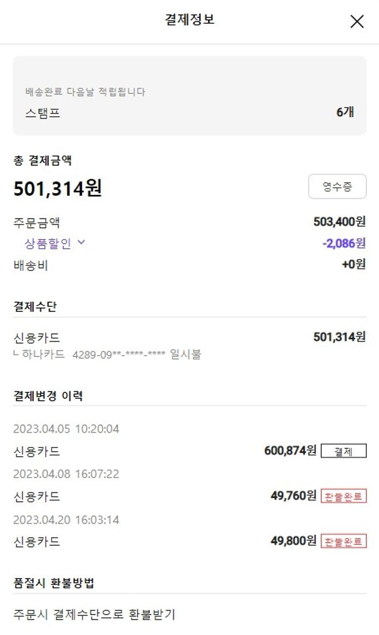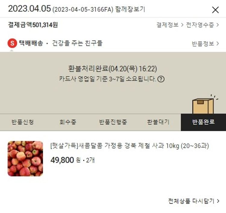 주문 건 중 환불 건 발생하여 2023. 04. 24. 재주문하였습니다.