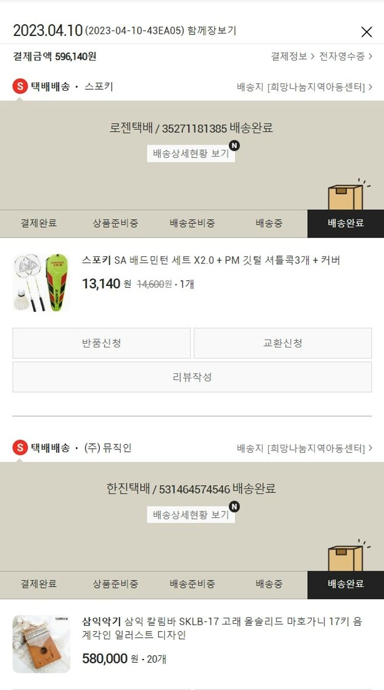 기부자님이 사용한 기부포인트 27,050원, 물품배송비 3,000원, 가격상승분 120원, 100원 미만 지원금 20원, 결제 수수료 15,499원, 기타 사업비는 행복나눔재단이 부담했습니다. (기부후기 발송시점에 최종 업데이트 됩니다.) 실제 쇼핑몰에서 확인되는 배송현황을 캡처한 내용입니다. 실시간 자료와는 차이가 있을 수 있습니다.