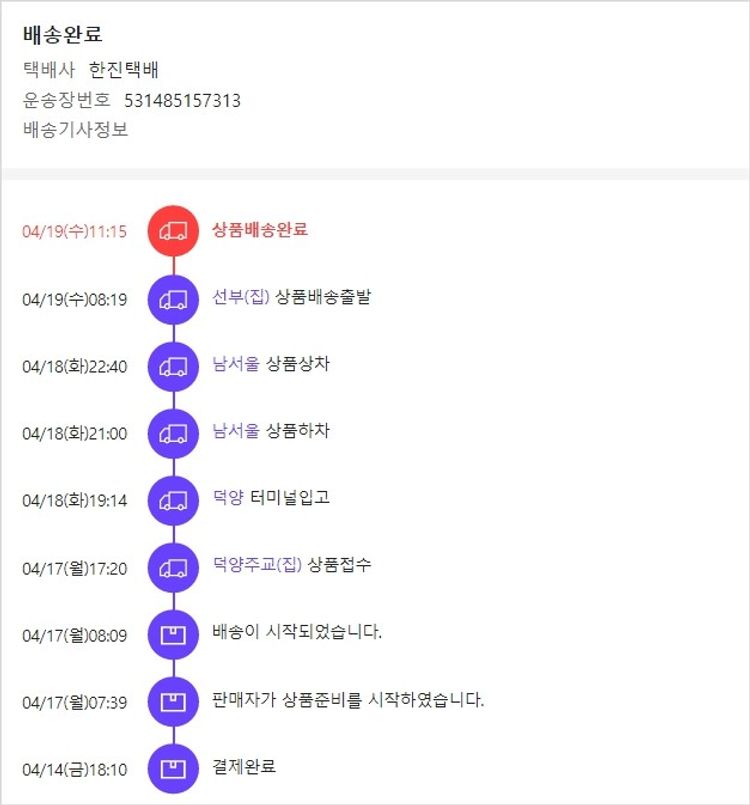 기부자님이 사용한 기부포인트 56,000원, 물품배송비 3,000원, 가격상승분 1,120원, 100원 미만 지원금 80원, 결제 수수료 13,833원, 기타 사업비는 행복나눔재단이 부담했습니다. (기부후기 발송시점에 최종 업데이트 됩니다.) 주문 건 중 품절 건 발생하여 2023. 04. 17. 재주문하였습니다. 실제 쇼핑몰에서 확인되는 배송현황을 캡처한 내용입니다. 실시간 자료와는 차이가 있을 수 있습니다.