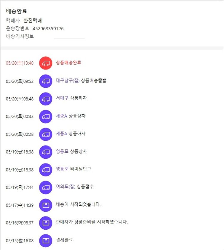 기부자님이 사용한 기부포인트 8,500원, 물품배송비 8,500원, 가격상승분 783원, 100원 미만 지원금 89원, 결제 수수료 10,775원, 기타 사업비는 행복나눔재단이 부담했습니다. (기부후기 발송시점에 최종 업데이트 됩니다.) 실제 쇼핑몰에서 확인되는 배송현황을 캡처한 내용입니다. 실시간 자료와는 차이가 있을 수 있습니다.