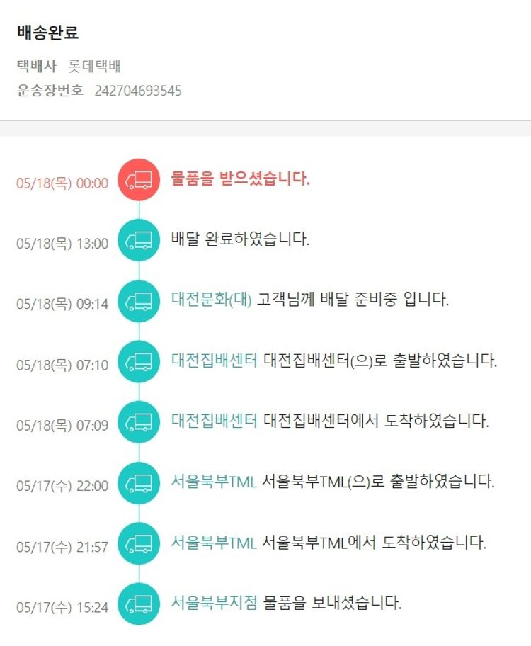 기부자님이 사용한 기부포인트 2,100원, 가격상승분 705원, 100원 미만 지원금 95원, 결제 수수료 14,508원, 기타 사업비는 행복나눔재단이 부담했습니다. (기부후기 발송시점에 최종 업데이트 됩니다.) 실제 쇼핑몰에서 확인되는 배송현황을 캡처한 내용입니다. 실시간 자료와는 차이가 있을 수 있습니다.