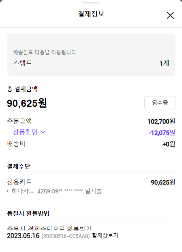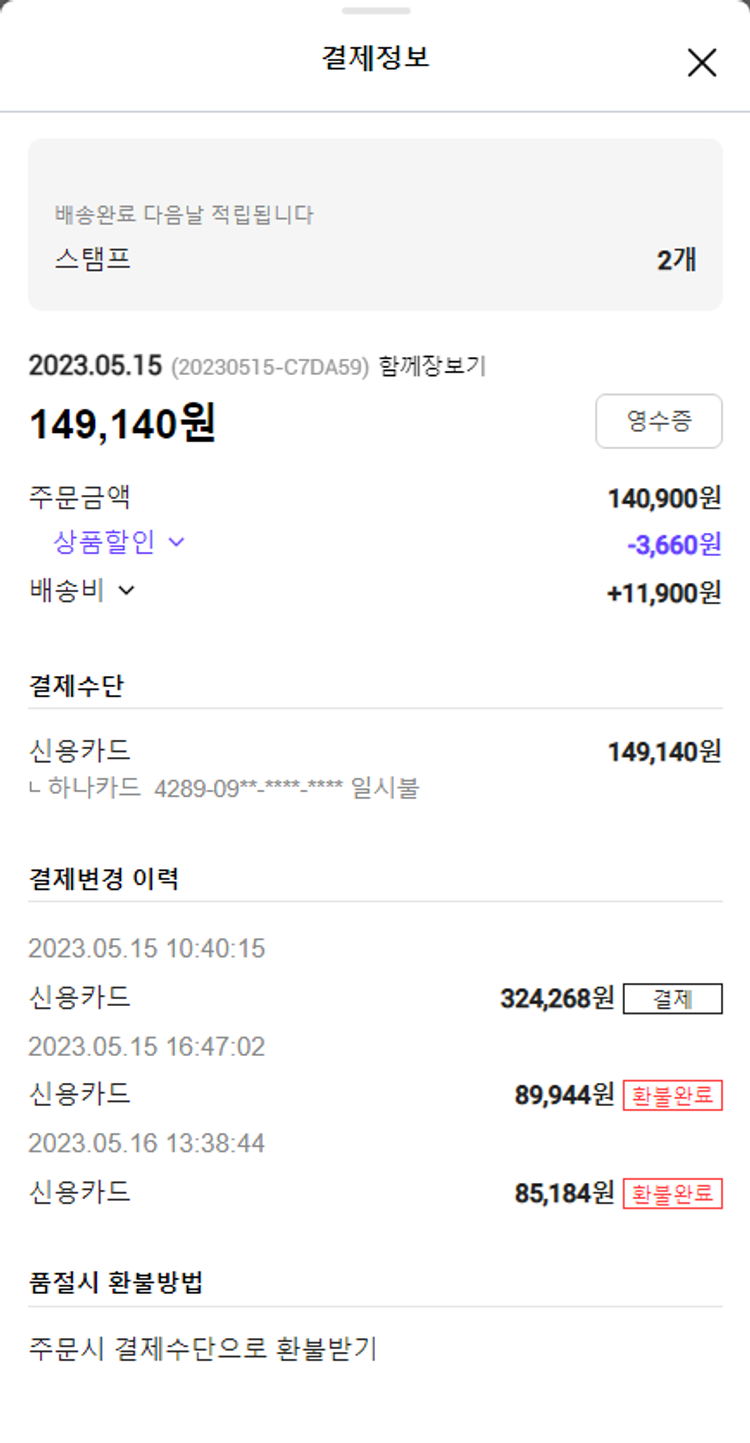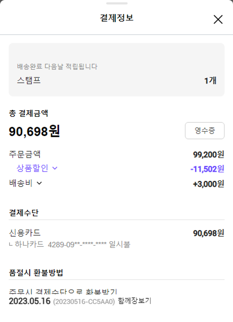 주문 건 중 품절 건 발생하여 2023. 05. 17. 재주문하였습니다.