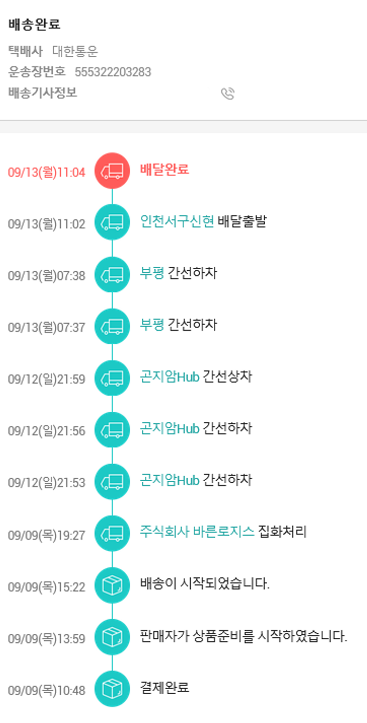 기부자님이 사용한 기부포인트 13,500원, 가격상승분 745원, 100원 미만 지원금 97원, 결제 수수료 13,049원, 기타 사업비는 행복나눔재단이 부담했습니다. (기부후기 발송시점에 최종 업데이트 됩니다.) 실제 쇼핑몰에서 확인되는 배송현황을 캡처한 내용입니다. 실시간 자료와는 차이가 있을 수 있습니다.