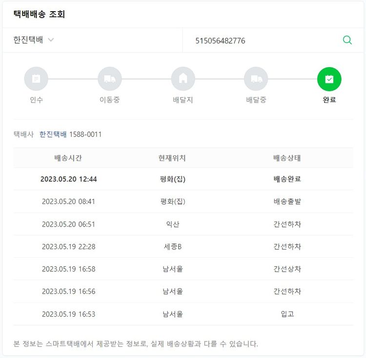 기부자님이 사용한 기부포인트 39,000원, 가격상승분 4,960원, 100원 미만 지원금 66원, 결제 수수료 5,782원, 기타 사업비는 행복나눔재단이 부담했습니다. (기부후기 발송시점에 최종 업데이트 됩니다.) 주문 건 중 품절 건 발생하여 2023. 05. 18. 재주문하였습니다. 실제 쇼핑몰에서 확인되는 배송현황을 캡처한 내용입니다. 실시간 자료와는 차이가 있을 수 있습니다.