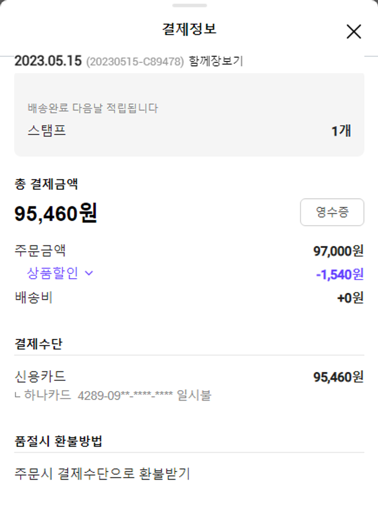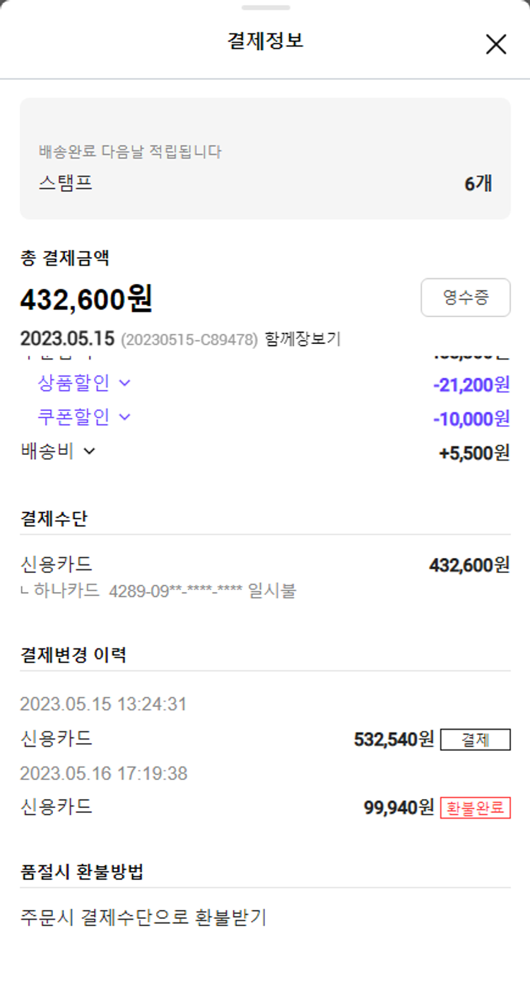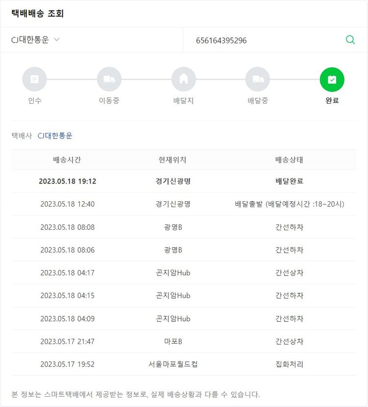 기부자님이 사용한 기부포인트 4,000원, 물품배송비 5,500원, 가격상승분 3,223원, 100원 미만 지원금 37원, 결제 수수료 9,636원, 기타 사업비는 행복나눔재단이 부담했습니다. (기부후기 발송시점에 최종 업데이트 됩니다.) 주문 건 중 품절 건 발생하여 2023. 05. 16. 재주문하였습니다. 실제 쇼핑몰에서 확인되는 배송현황을 캡처한 내용입니다. 실시간 자료와는 차이가 있을 수 있습니다.