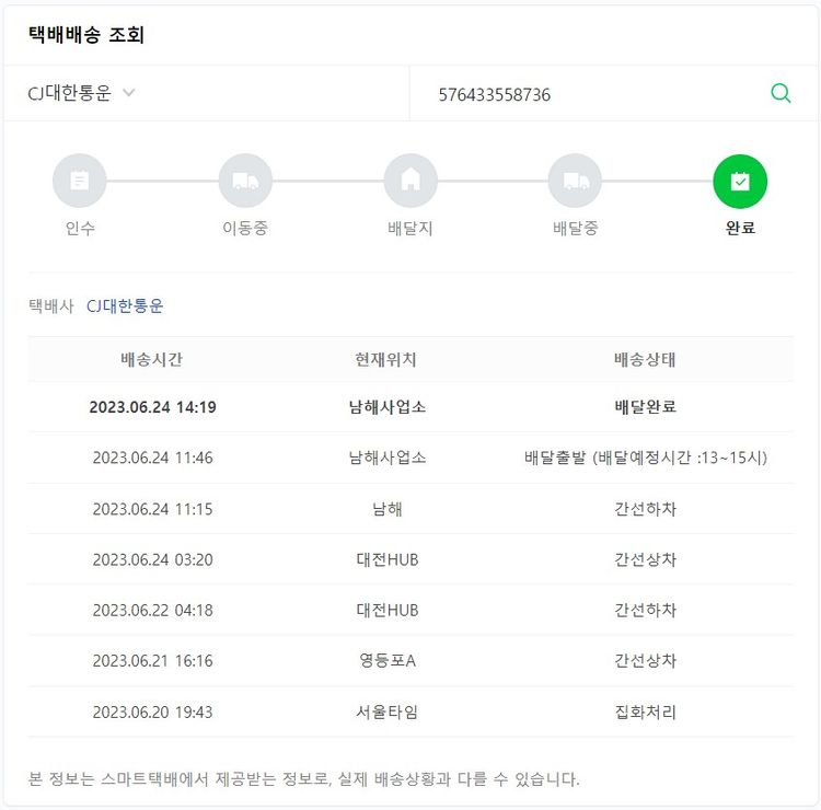 물품배송비 14,500원, 가격상승분 378원, 100원 미만 지원금 49원, 결제 수수료 16,363원, 기타 사업비는 행복나눔재단이 부담했습니다. (기부후기 발송시점에 최종 업데이트 됩니다.) 주문 건 중 품절 건 발생하여 2023. 06. 19. 재주문하였습니다. 실제 쇼핑몰에서 확인되는 배송현황을 캡처한 내용입니다. 실시간 자료와는 차이가 있을 수 있습니다.