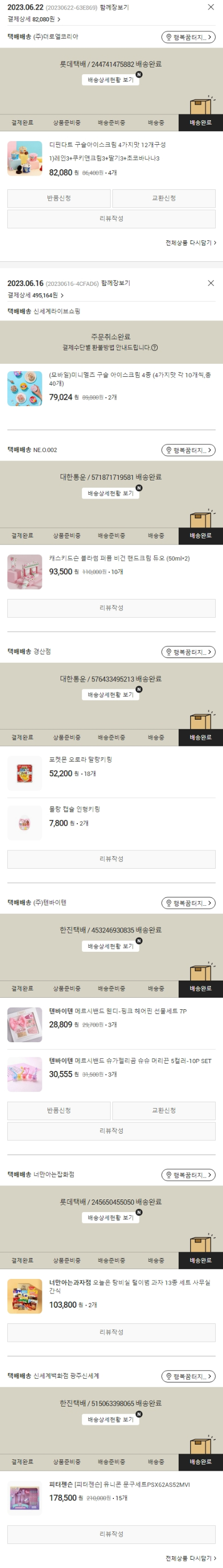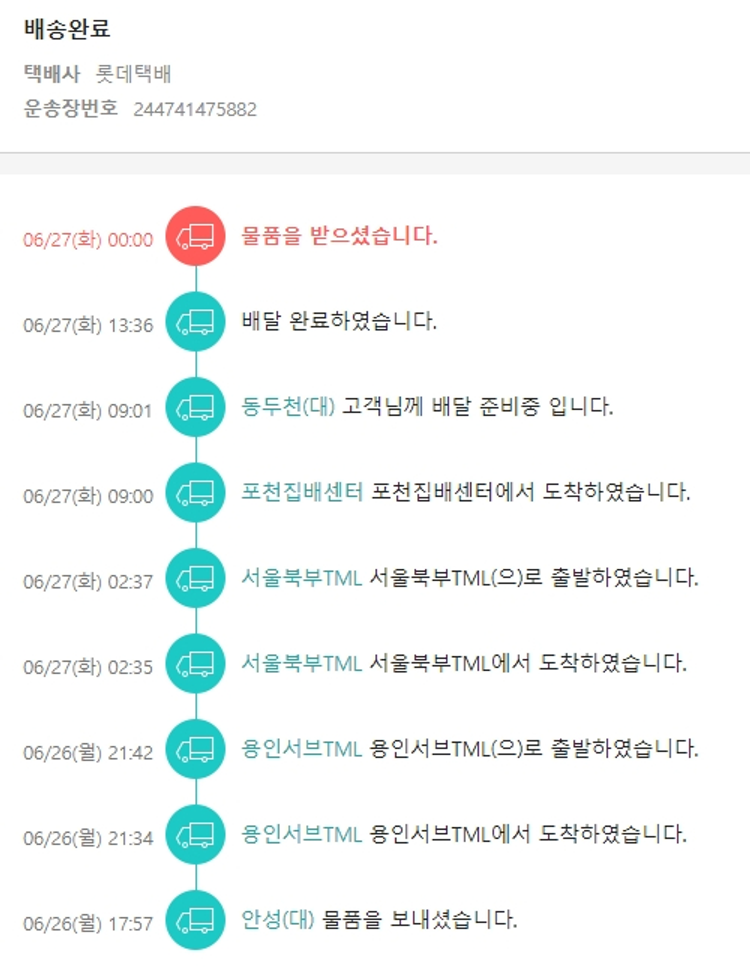 기부자님이 사용한 기부포인트 40,000원, 가격상승분 3,956원, 100원 미만 지원금 88원, 결제 수수료 10,330원, 기타 사업비는 행복나눔재단이 부담했습니다. (기부후기 발송시점에 최종 업데이트 됩니다.) 주문 건 중 품절 건 발생하여 2023. 06. 22. 재주문하였습니다. 실제 쇼핑몰에서 확인되는 배송현황을 캡처한 내용입니다. 실시간 자료와는 차이가 있을 수 있습니다.