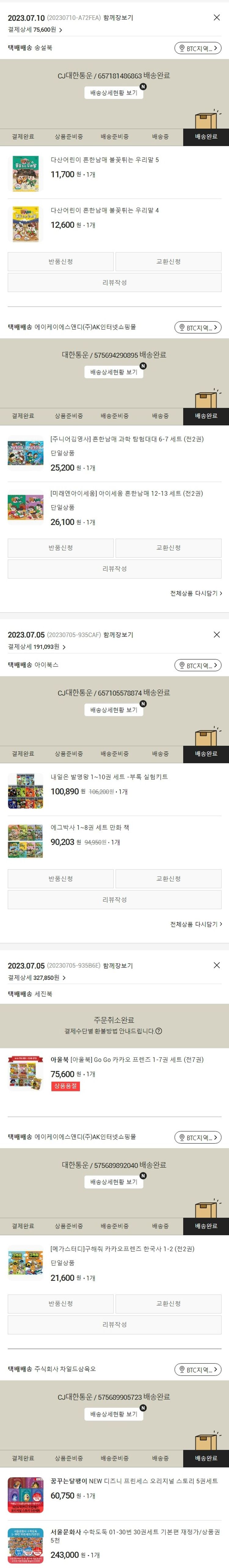 기부자님이 사용한 기부포인트 43,750원, 물품배송비 2,500원, 가격상승분 3,028원, 100원 미만 지원금 15원, 결제 수수료 13,272원, 기타 사업비는 행복나눔재단이 부담했습니다. (기부후기 발송시점에 최종 업데이트 됩니다.) 주문 건 중 품절 건 발생하여 2023. 07. 10. 재주문하였습니다. 실제 쇼핑몰에서 확인되는 배송현황을 캡처한 내용입니다. 실시간 자료와는 차이가 있을 수 있습니다.