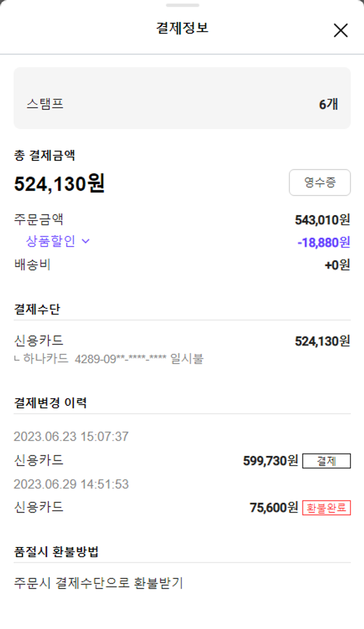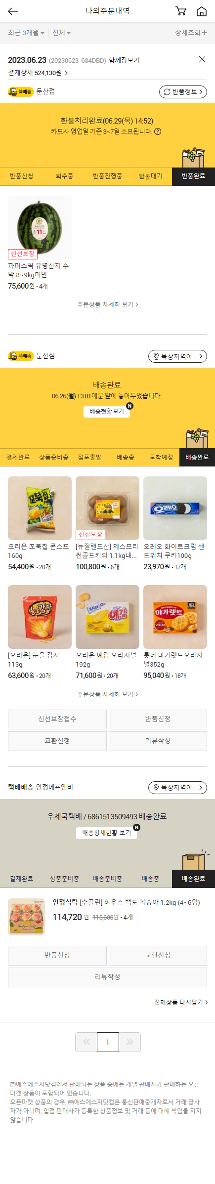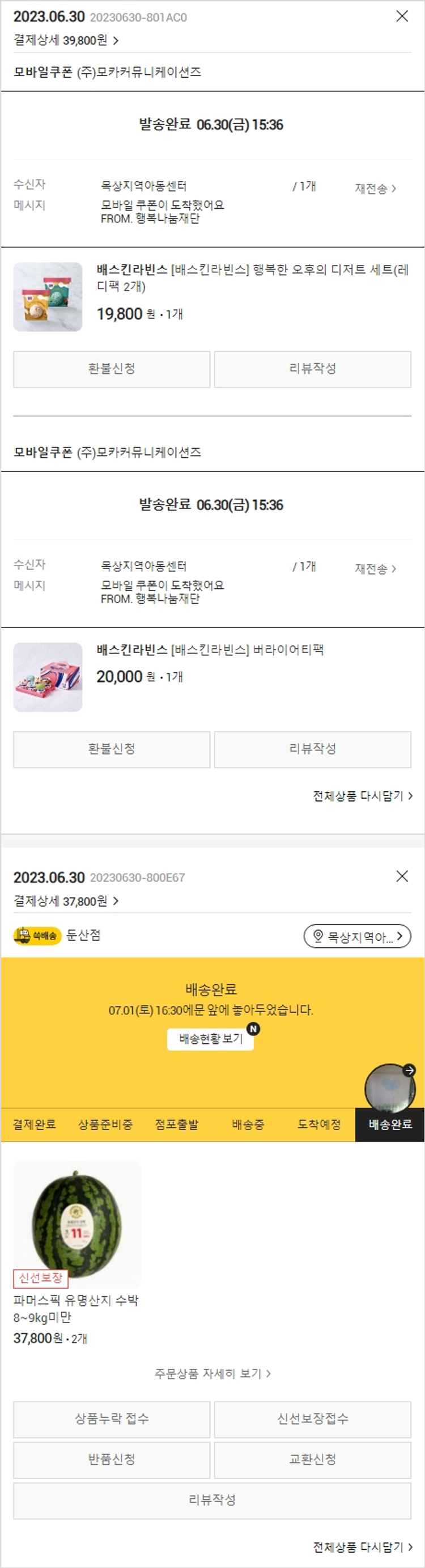 기부자님이 사용한 기부포인트 61,100원, 가격상승분 2,000원, 100원 미만 지원금 30원, 결제 수수료 12,794원, 기타 사업비는 행복나눔재단이 부담했습니다. (기부후기 발송시점에 최종 업데이트 됩니다.) 수박 상품 일부 품절 및 내부 일정으로 인하여 2023. 06. 30. 센터 담당자와 협의 후 모바일 쿠폰 주문하였습니다. 실제 쇼핑몰에서 확인되는 배송현황을 캡처한 내용입니다. 실시간 자료와는 차이가 있을 수 있습니다.
