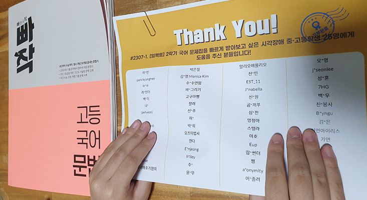 “문제집 한권에 수백만원이라니. 정말 큰 비용입니다. 하지만 아무리 공부하고 싶은 학생도 문제집을 제때 받아보려면 수백만원을 부담해야 하는 상황이니, 정말 공부를 하고 싶어도 못하는 현실입니다. 기부자님들의 도움을 통해 대상 아이들 뿐 아니라, 앞으로 해당 학년에 진학 할 여러 시각장애 학생들이 볼 점자 문제집 한권이 더 생기게 됩니다. 소중한 도움에 감사드립니다. ”